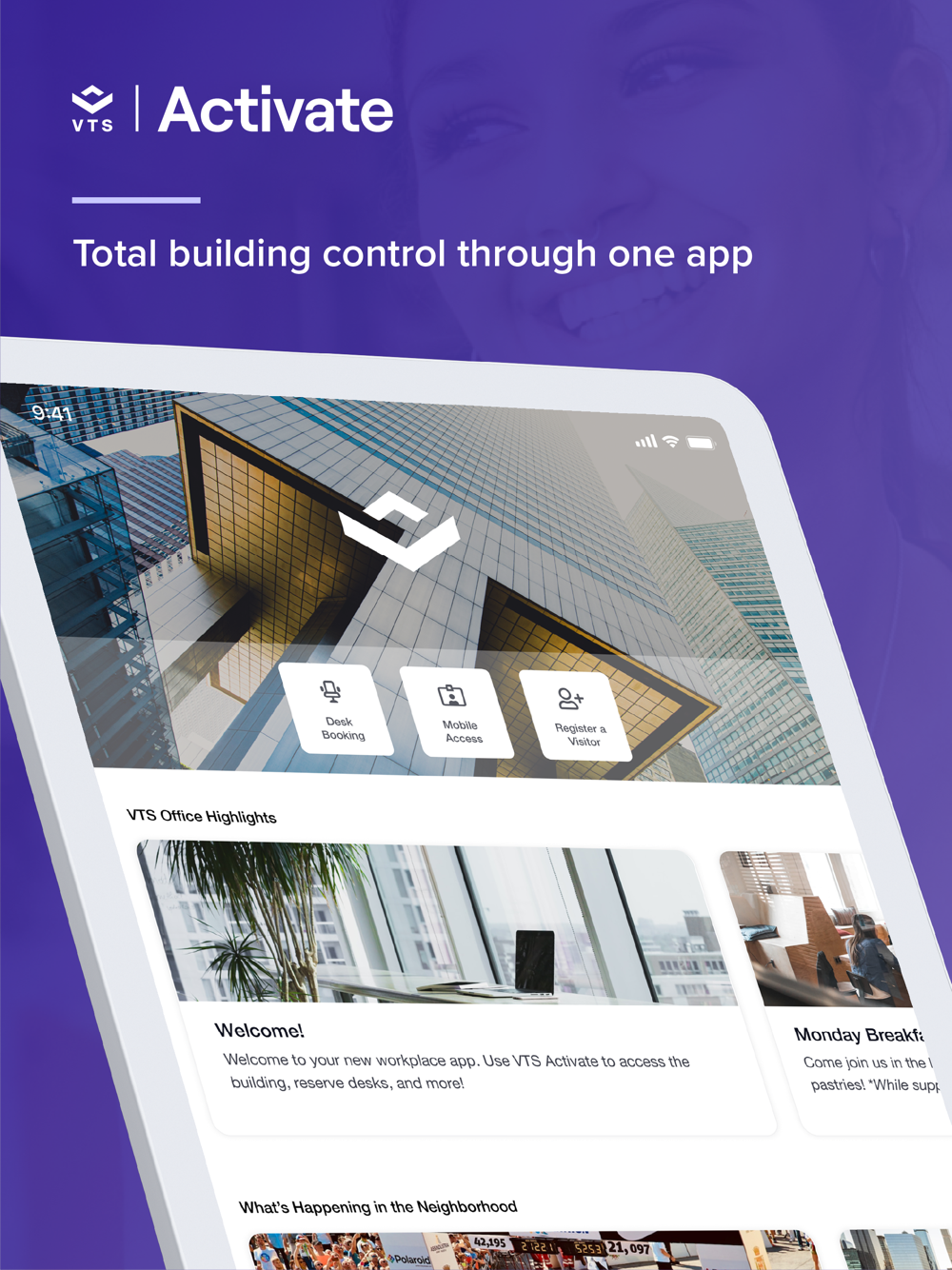 Unlock everything your workplace offers with the VTS Activate app. From building access to booking services, VTS Activate helps you get more out of your workplace. Make the most of available amenities and spaces, and get real-time updates on important updates and exclusive events through one app—VTS Activate.