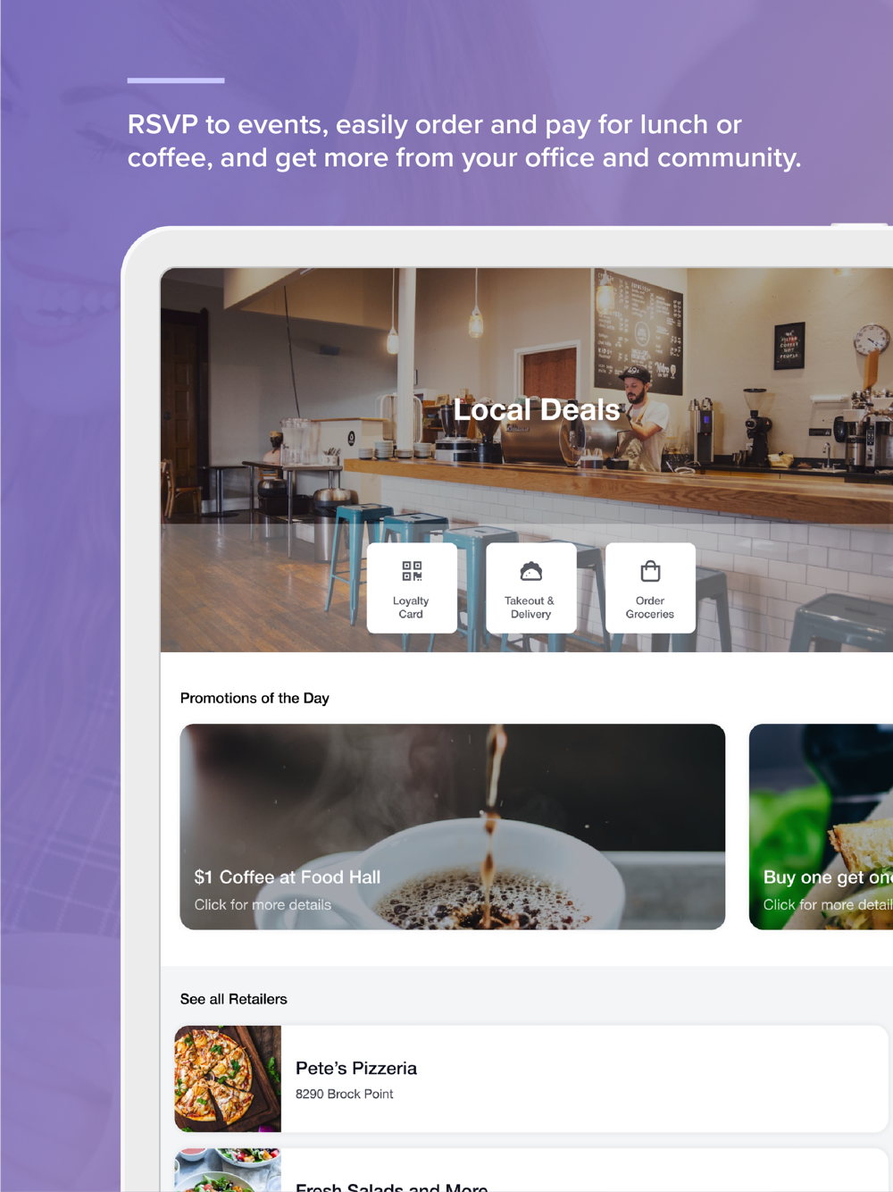 Elevate your office experience. RSVP to events, easily order and pay for lunch or coffee, and get more from your office, neighborhood, and community.