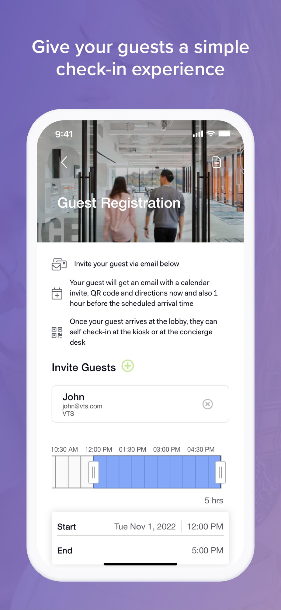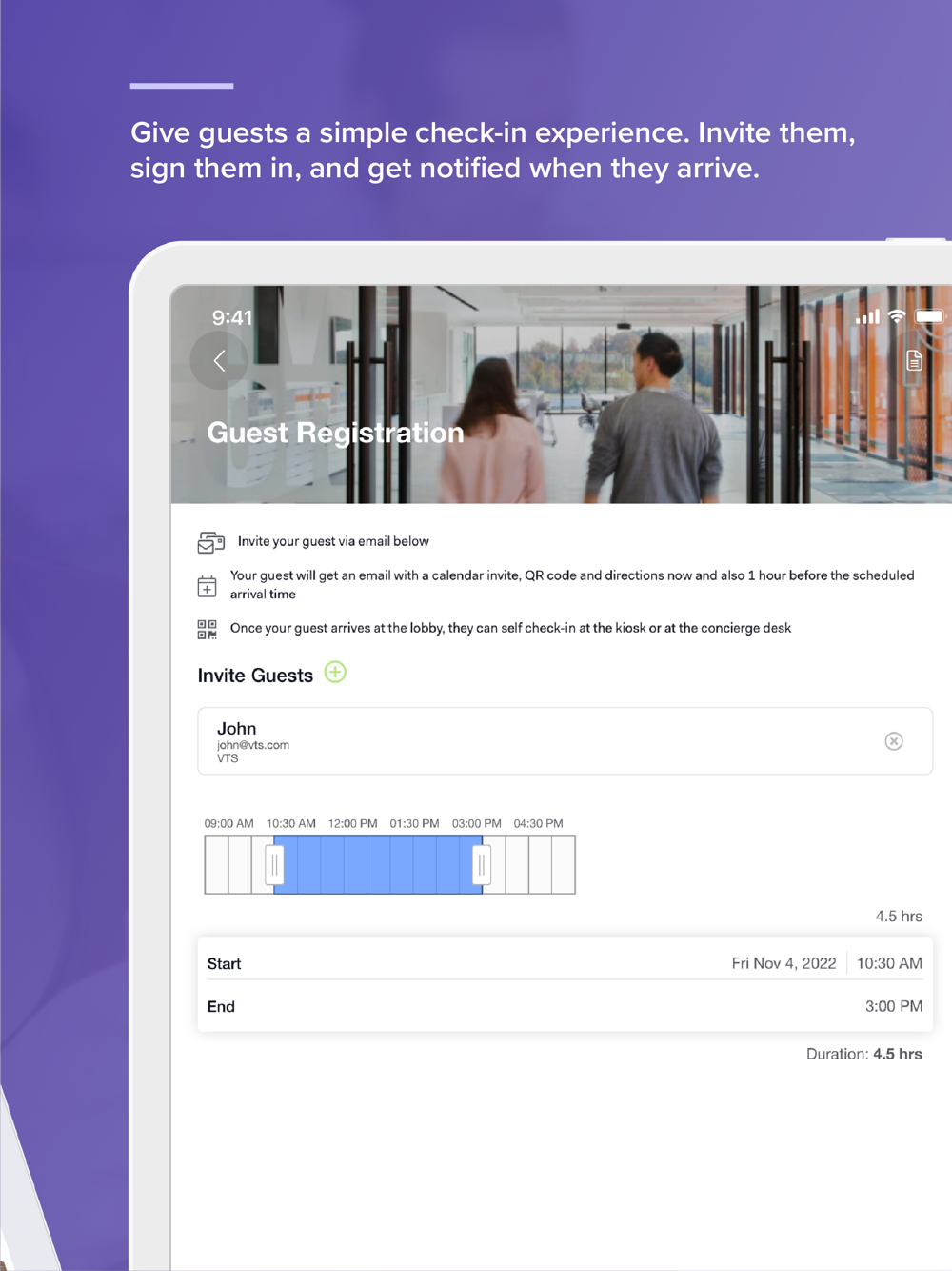 Give guests a simple check-in experience. Invite them, sign them in, and get notified when they arrive.