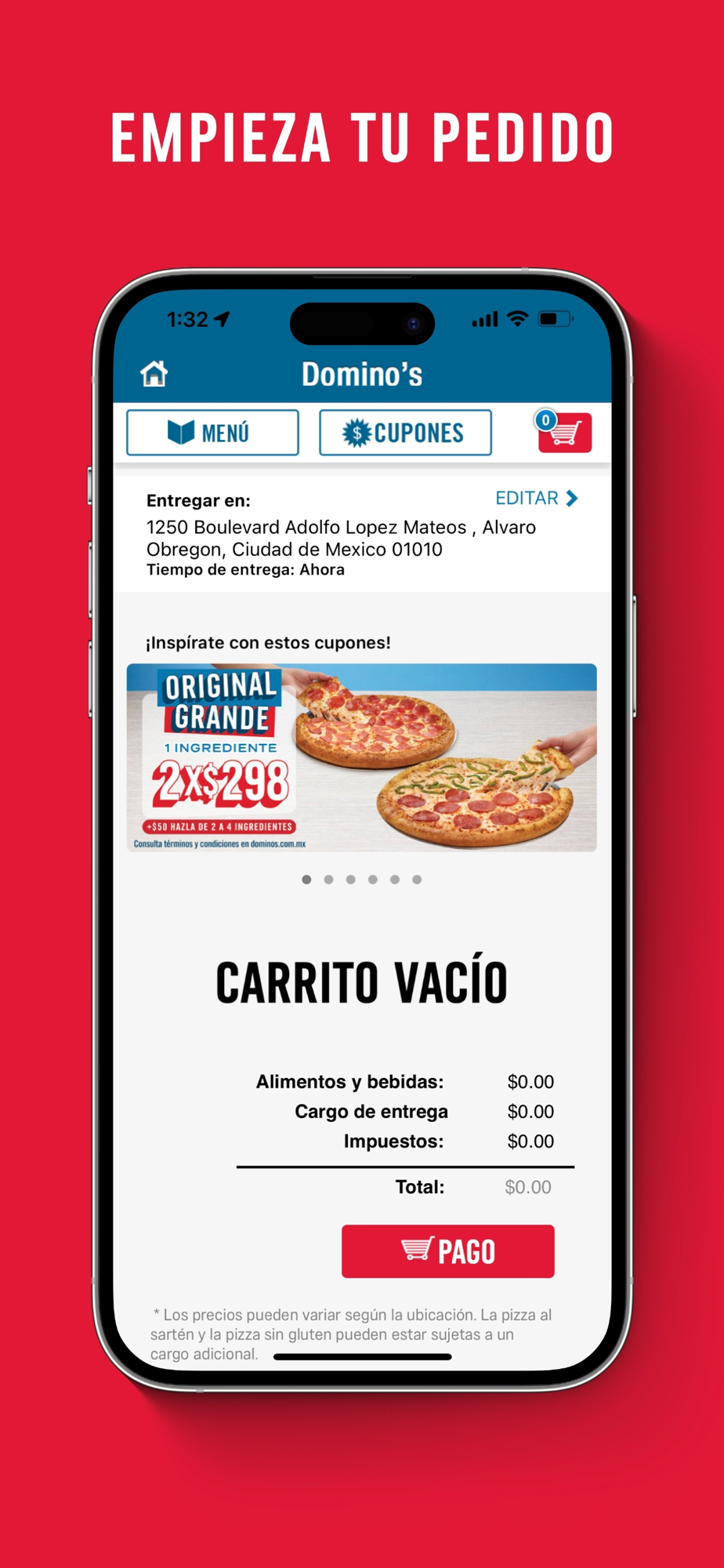 Ordena tu pizza favorita desde cualquier lugar con la app DominosMX y disfruta de muchas funcionalidades como realizar tus pagos en línea con tarjeta, pagar contra entrega en efectivo, vales o tarjeta o recoge directamente tu orden en la tienda Domino's que tú elijas.