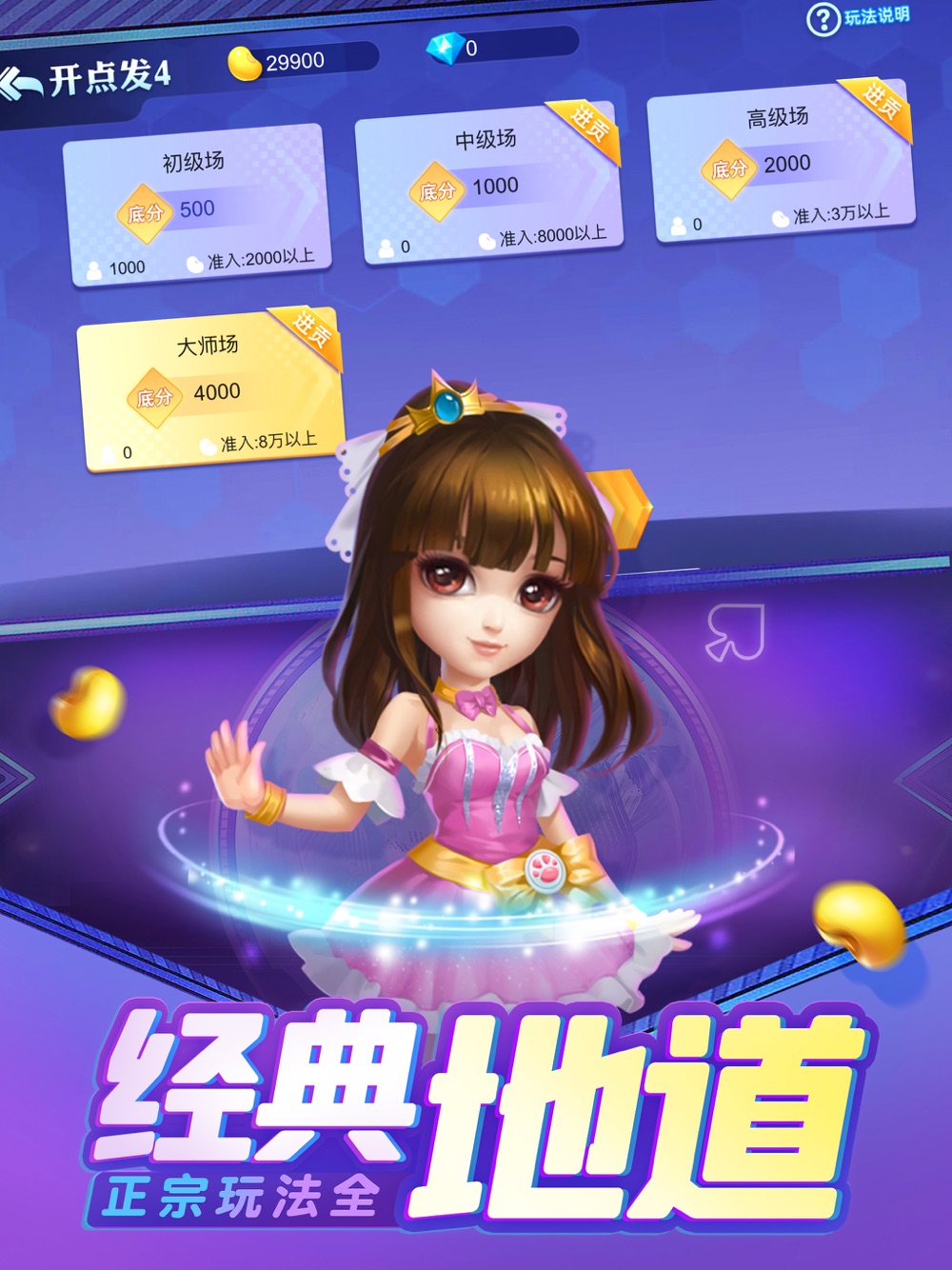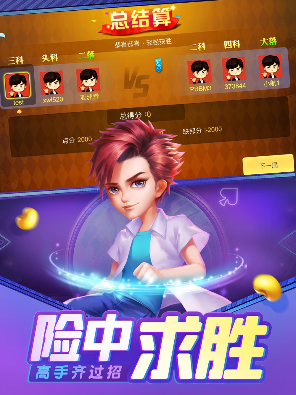 《天天够级》拥有丰富的玩法和场次,包括”开点发4“,”6副牌“,”大王2杀1“等,进不进贡随你选择!
