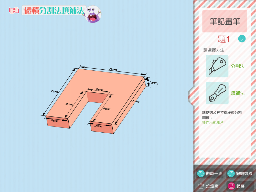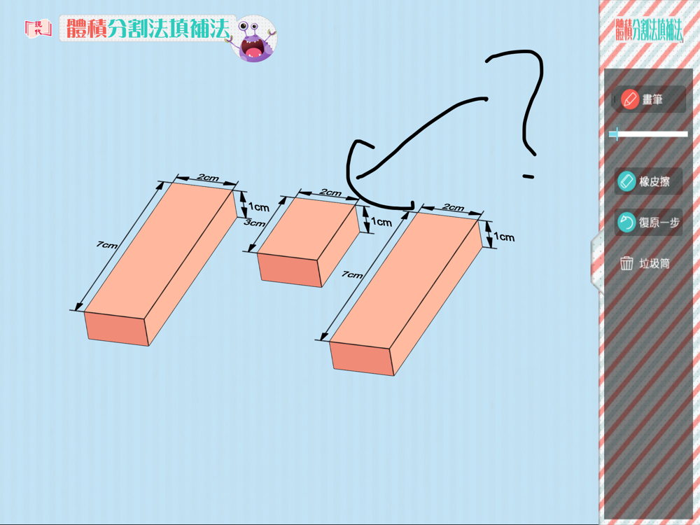 利用立體圖形進行活動,讓學生掌分割法及填補法。