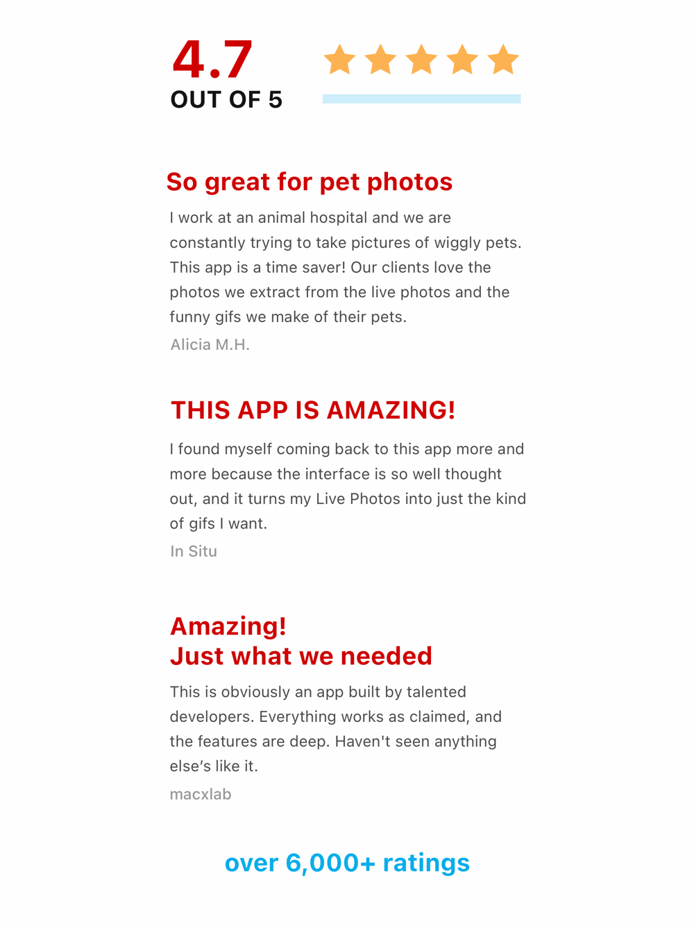 Lively gives you full control of your GIFs with extensive editing features: trim, play backward, auto reverse and speed control. GIF size too big? You can make it smaller too. Last by not least, full 3D Touch support. Gotta press that screen.