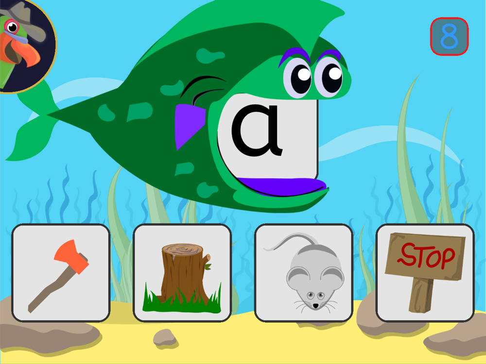 1 - Titus is Fishing: Matching a spoken sound to the written sound, starts easy with only one choice, then gets harder.