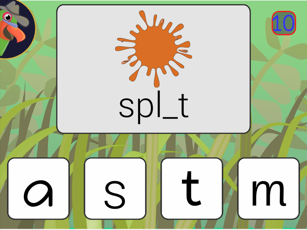 4 - What's Missing: An image and its word are shown with the target letter missing from the beginning, middle or end of the word. Select the correct letter or letter sound and drag it into place.
