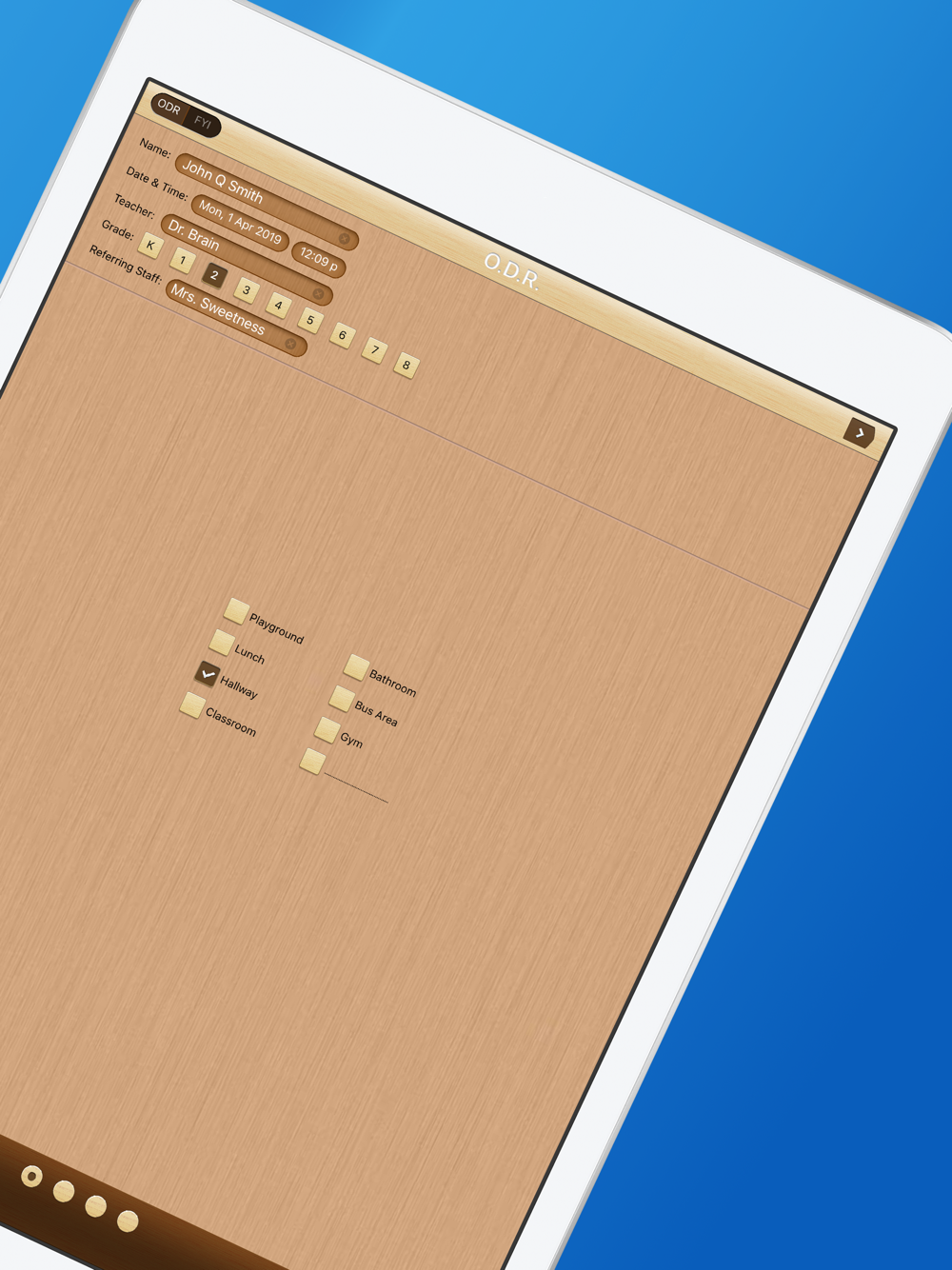 The Office Discipline Referral app enables staff of Custer, Nesbit, Costaño and Dossin Schools to fill out and export a custom pdf file of their school's multi-page office discipline referral paperwork (or a one page FYI document). The Office Discipline Referral app automatically saves each event, permitting staff to start an entry in the field and then return to it as time allows.