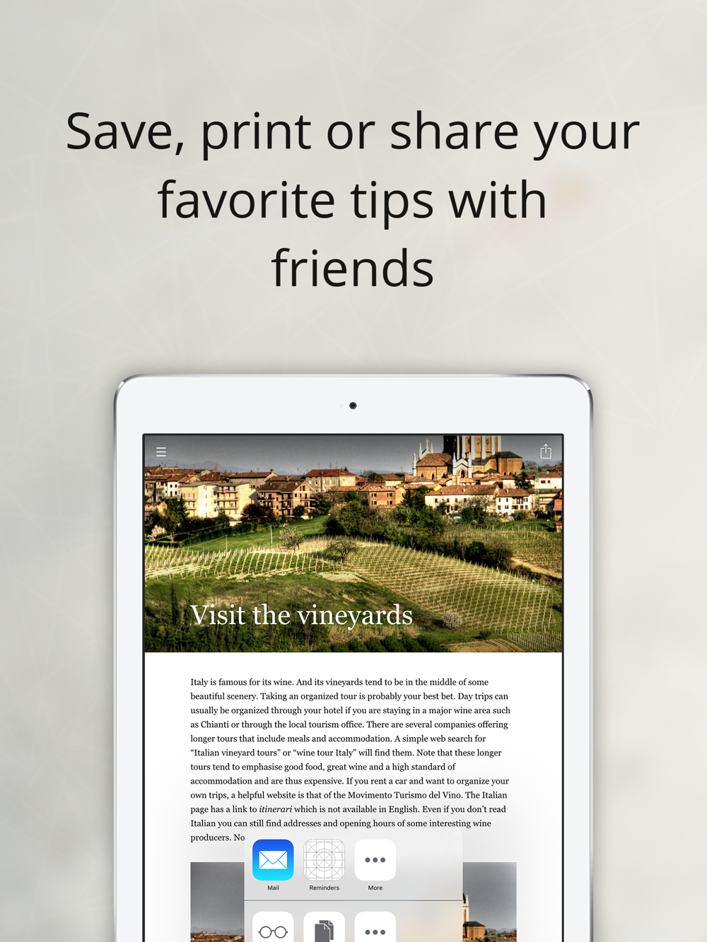 Once opened articles are always available offline, allowing you to save on expensive data roaming. You can also save, send by email or print articles and fast tips.