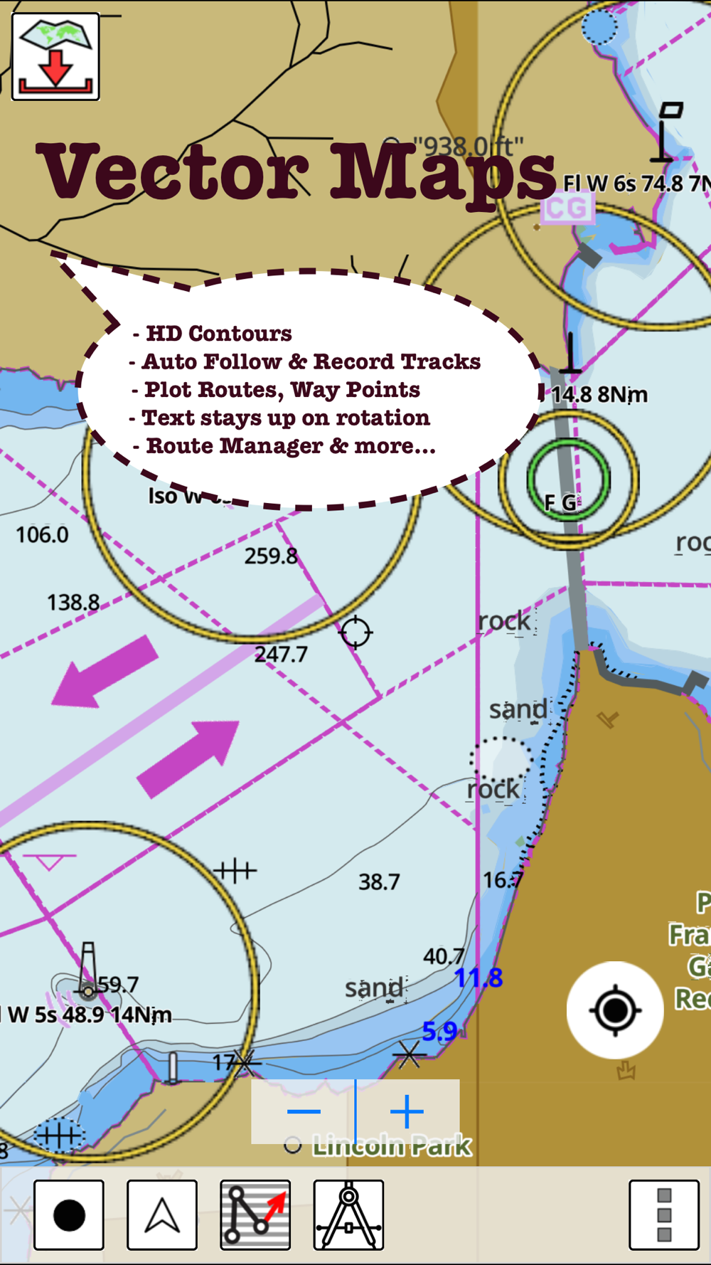 GPS Marine Charts App offers access to charts covering South African waters (derived from SANHO data). First marine GPS app to have route assistance with Voice Prompts for marine navigation. You can create new boating routes or import existing GPX/KML routes. It supports Nautical Charts course up orientation. Includes Tide & Currents prediction.