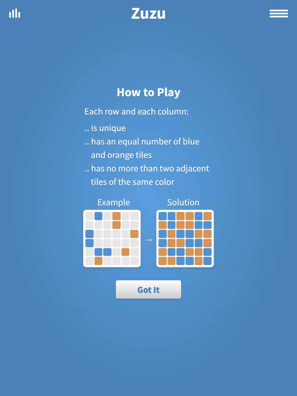 Your goal is to fill in the board using only logical determination, similar to Sudoku. Tap a tile on the board to set or change its color. Like the binary number system in general, there are only two tile colors, orange (0) and blue (1). Zuzu games begin with an unfinished grid that must be filled in correctly according to three rules listed below.