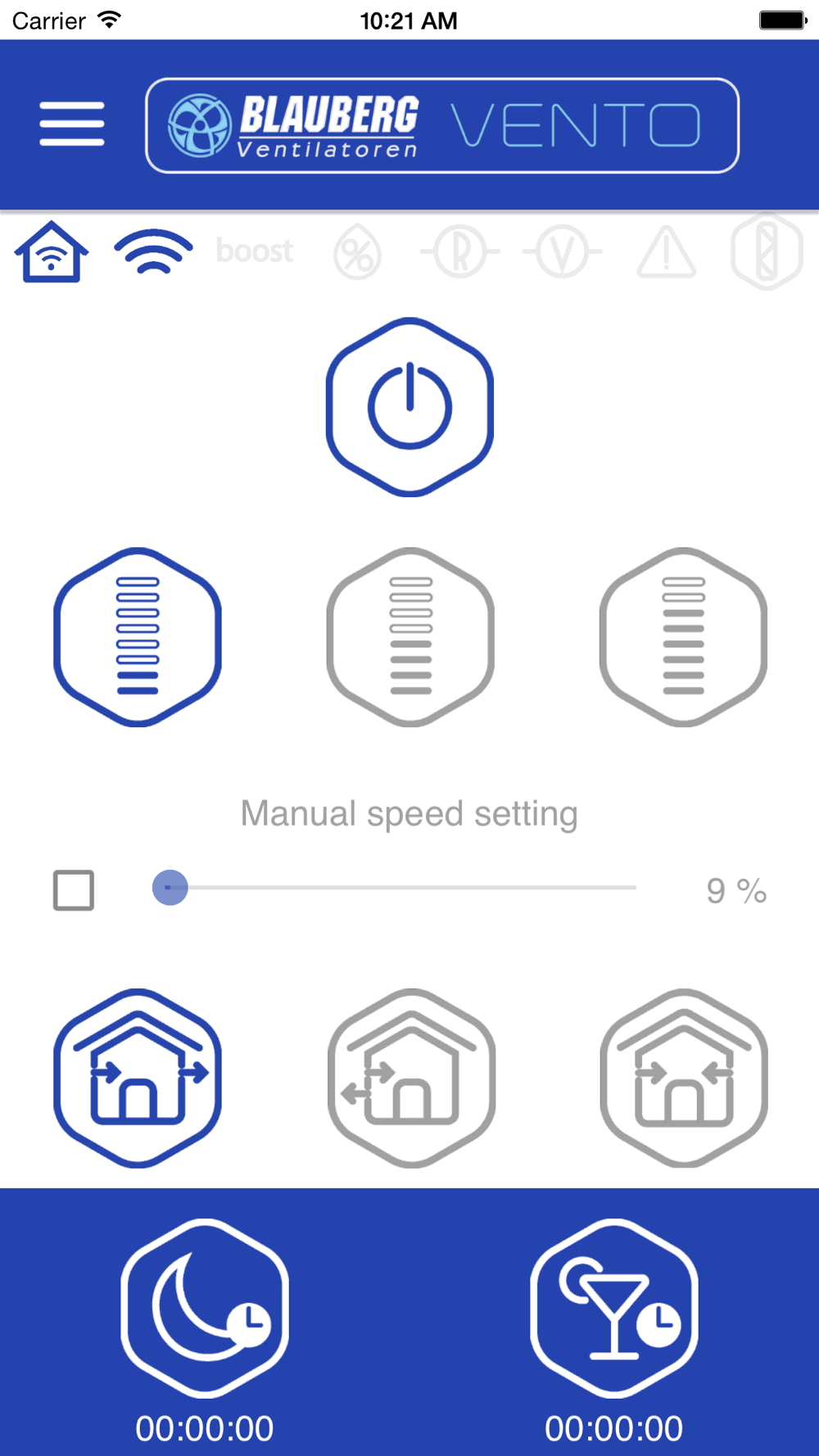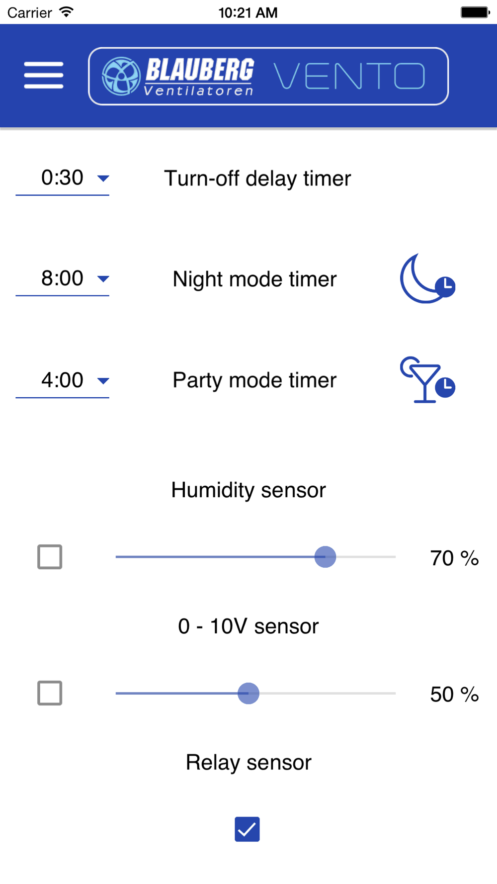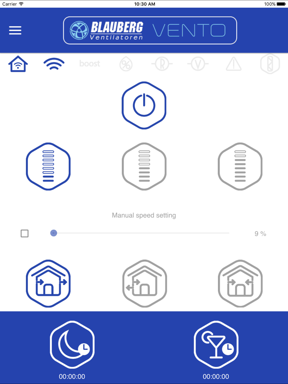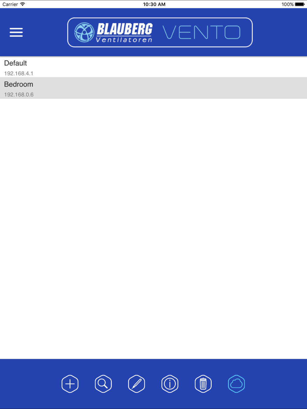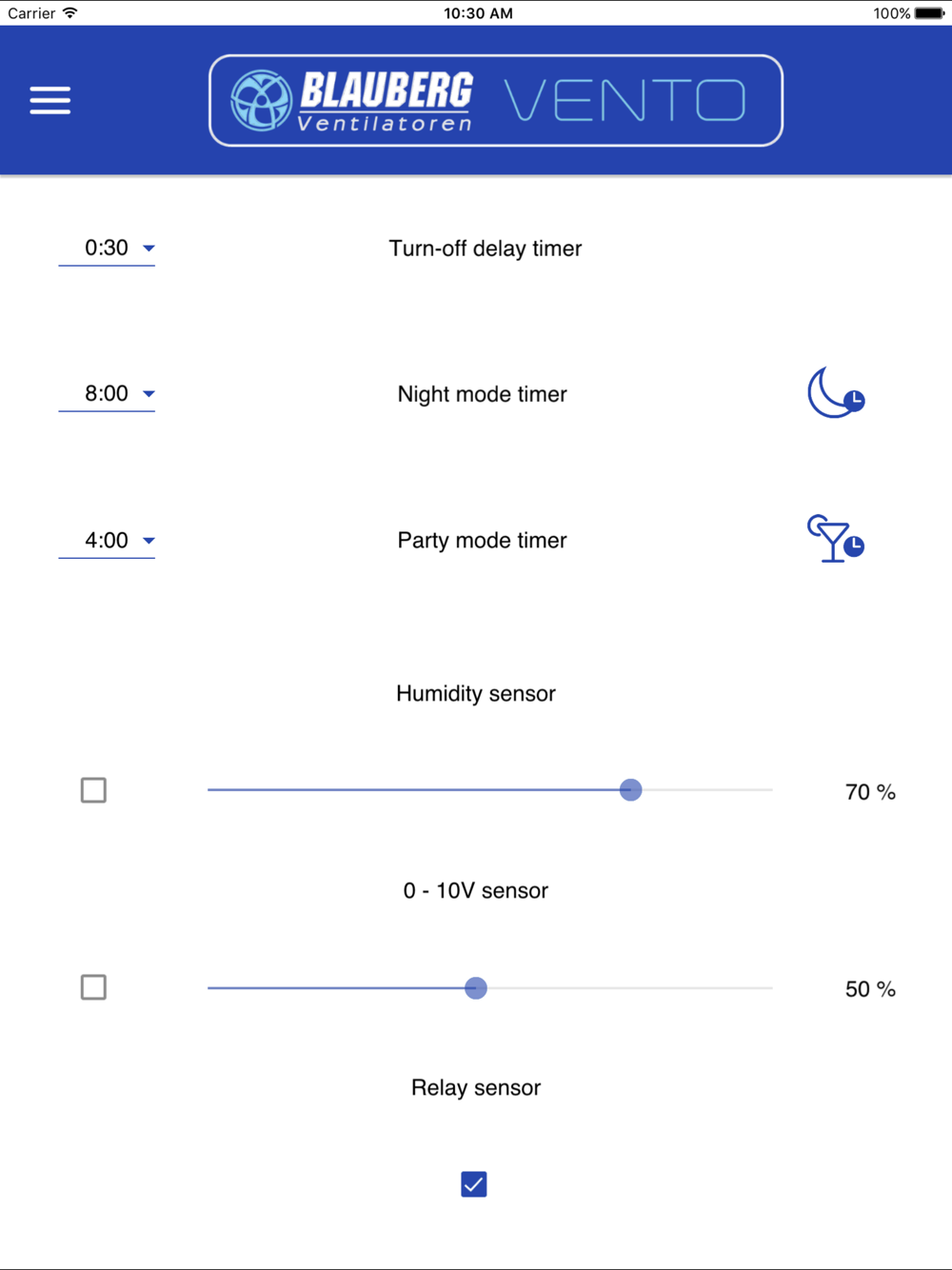 The application is specially designed for comfortable control of Blauberg Vento units. Its use is more functional and practical than operating the unit with the controls on the casing. Now you do not have to stand up and go to the ventilator to operate it. Enjoy your leisure time on a comfortable couch anywhere you have access to W-Fi and operate your Blauberg Vento ventilators. Integrate several Blauberg Vento units into a single network and operate all of them with a single touch.