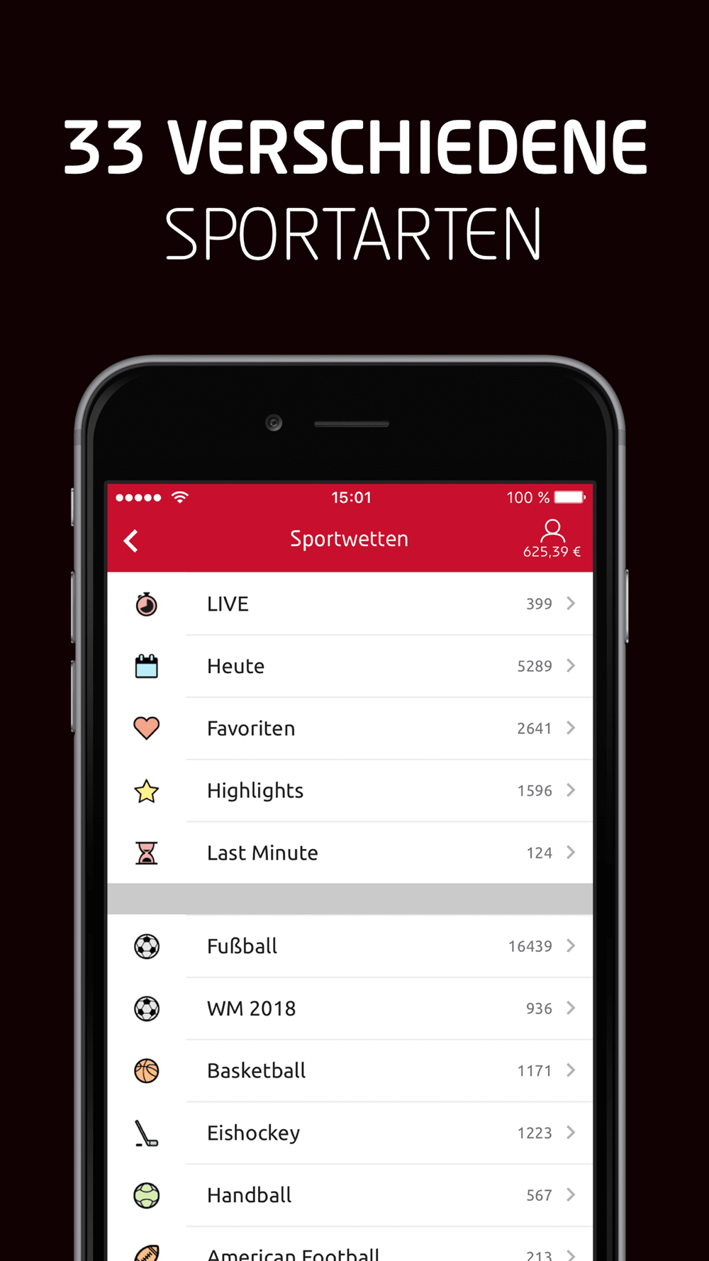 Mit der Tipico Sportwetten App sparst du dir Zeit, denn es genügt eine Applikation für Sportwetten sämtlicher Sportarten wie Fußball, Tennis, Basketball, Football, eSports, Rugby, Formel 1 etc. mit den dazugehörigen Livescores, Quoten und Ergebnissen.