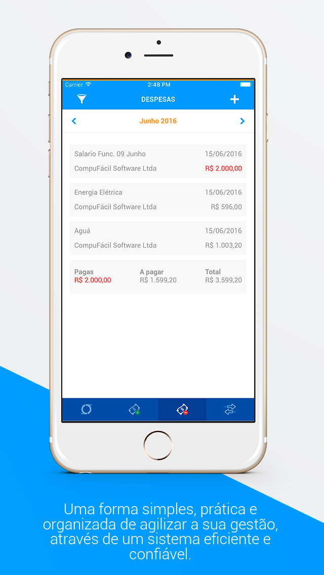 Com o aplicativo você pode lançar suas movimentações de onde estiver, tornando o controle mais simples, economizando tempo para você.