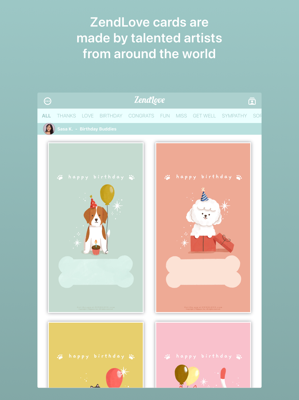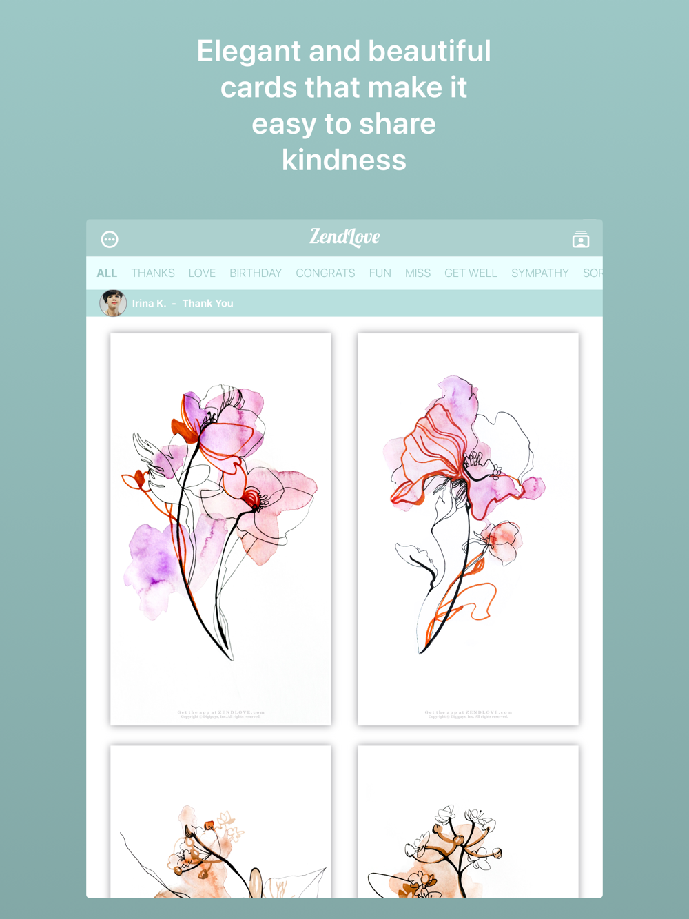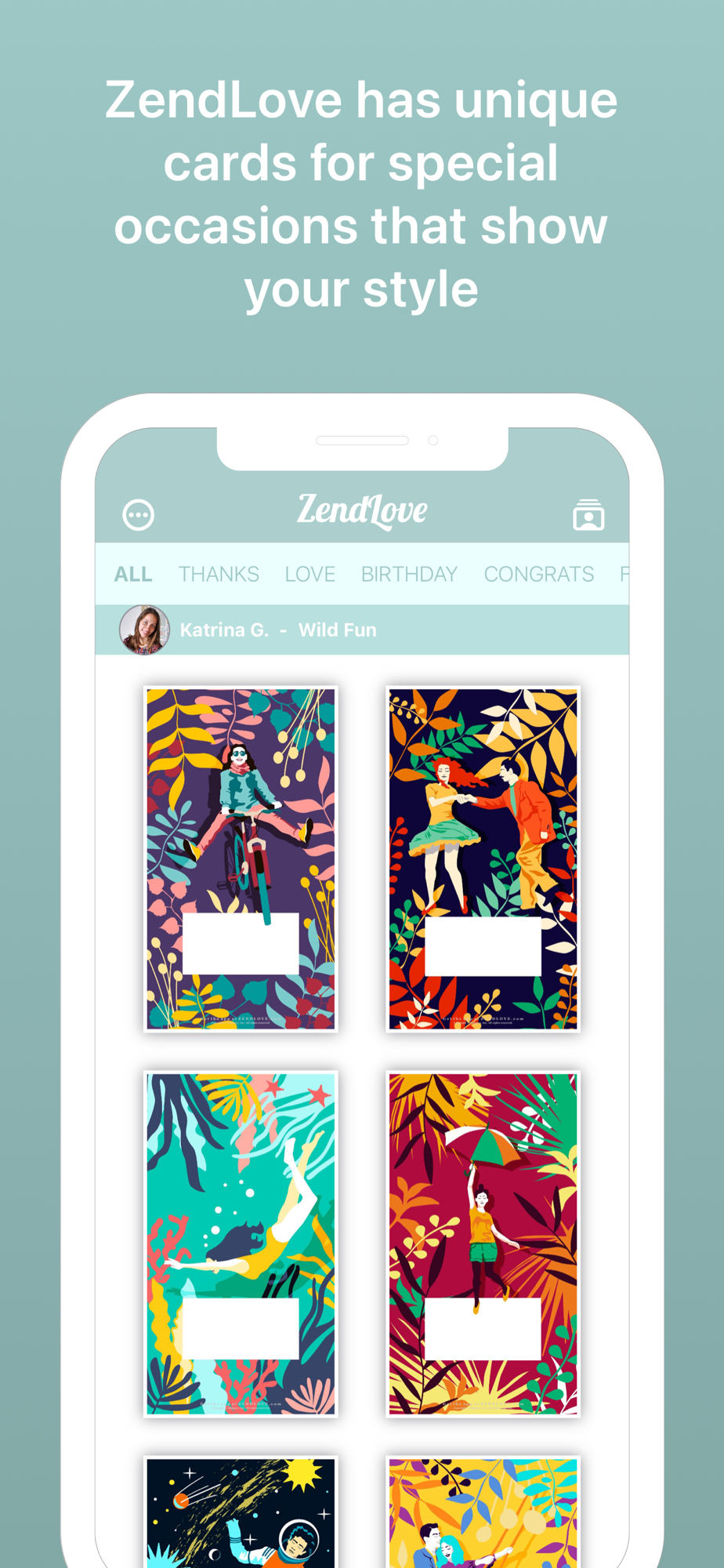 ZendLove lets you share love with artistic digital greeting cards made by talented artists from around the world. ZendLove has unique cards that show your style for any special occasion. Select a beautiful card, then write a message to make it personally yours and share it with loved ones. Share your personalized ZendLove cards instantly via Apple iMessage, WhatsApp, Texting, Email, Facebook Messenger, and more. Using ZendLove cards is good for the environment, with minimal carbon footprint compared with traditional paper greeting cards - no waste, no stamps, and no trips to the mailbox.