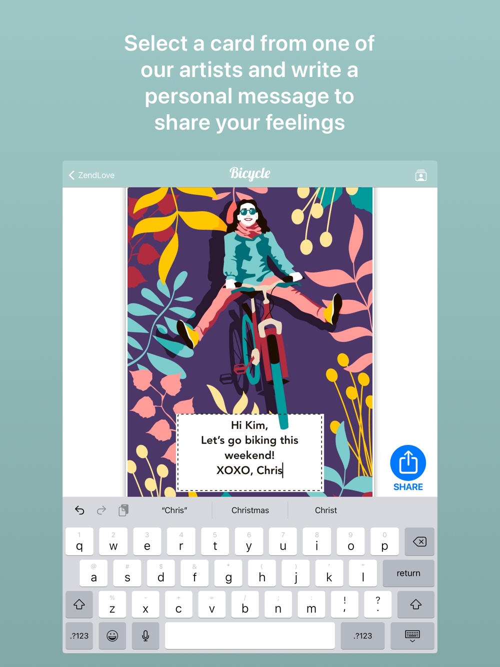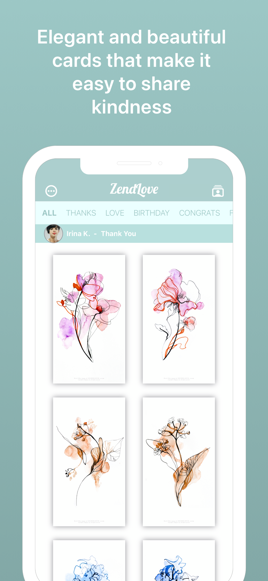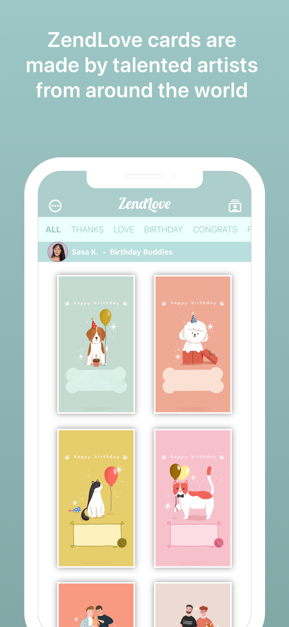 ZendLove lets you share love with artistic digital greeting cards made by talented artists from around the world. ZendLove has unique cards that show your style for any special occasion. Select a beautiful card, then write a message to make it personally yours and share it with loved ones. Share your personalized ZendLove cards instantly via Apple iMessage, WhatsApp, Texting, Email, Facebook Messenger, and more. Using ZendLove cards is good for the environment, with minimal carbon footprint compared with traditional paper greeting cards - no waste, no stamps, and no trips to the mailbox.