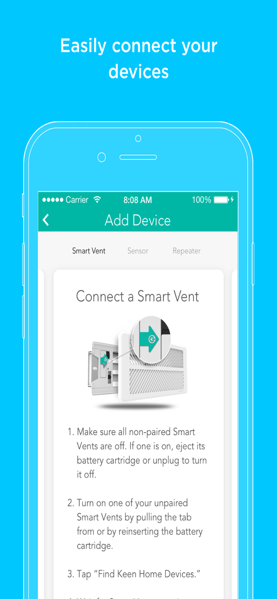 Easily connect your Smart Vents, Smart Bridge, and Temp Sensors in the app with quick access to tutorial videos and troubleshooting help.