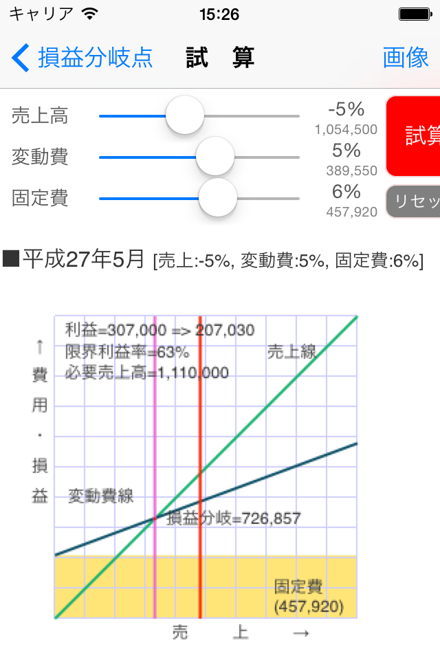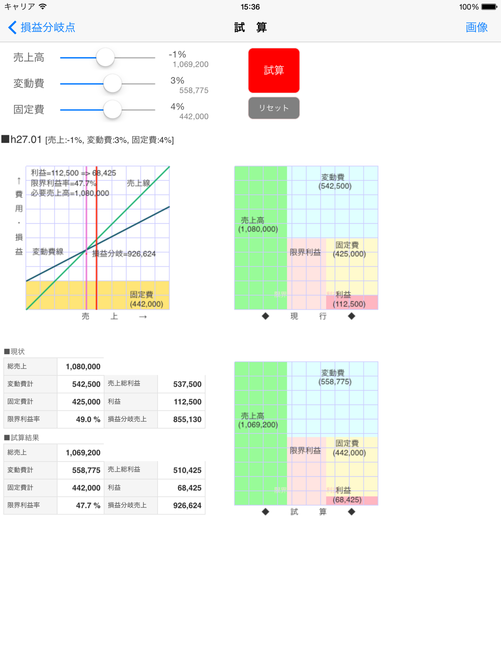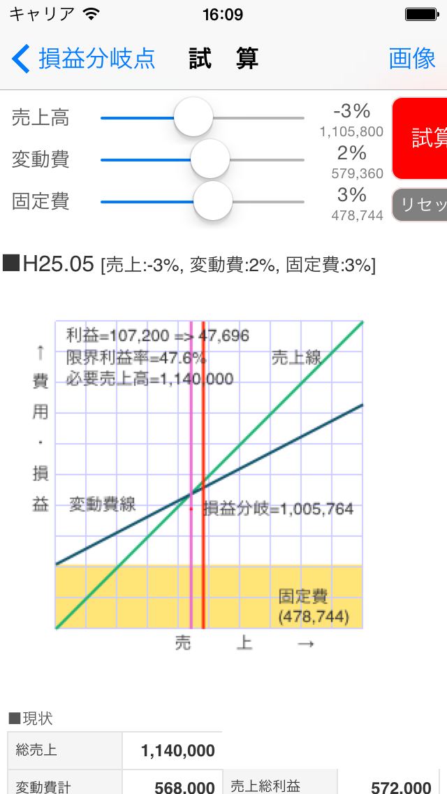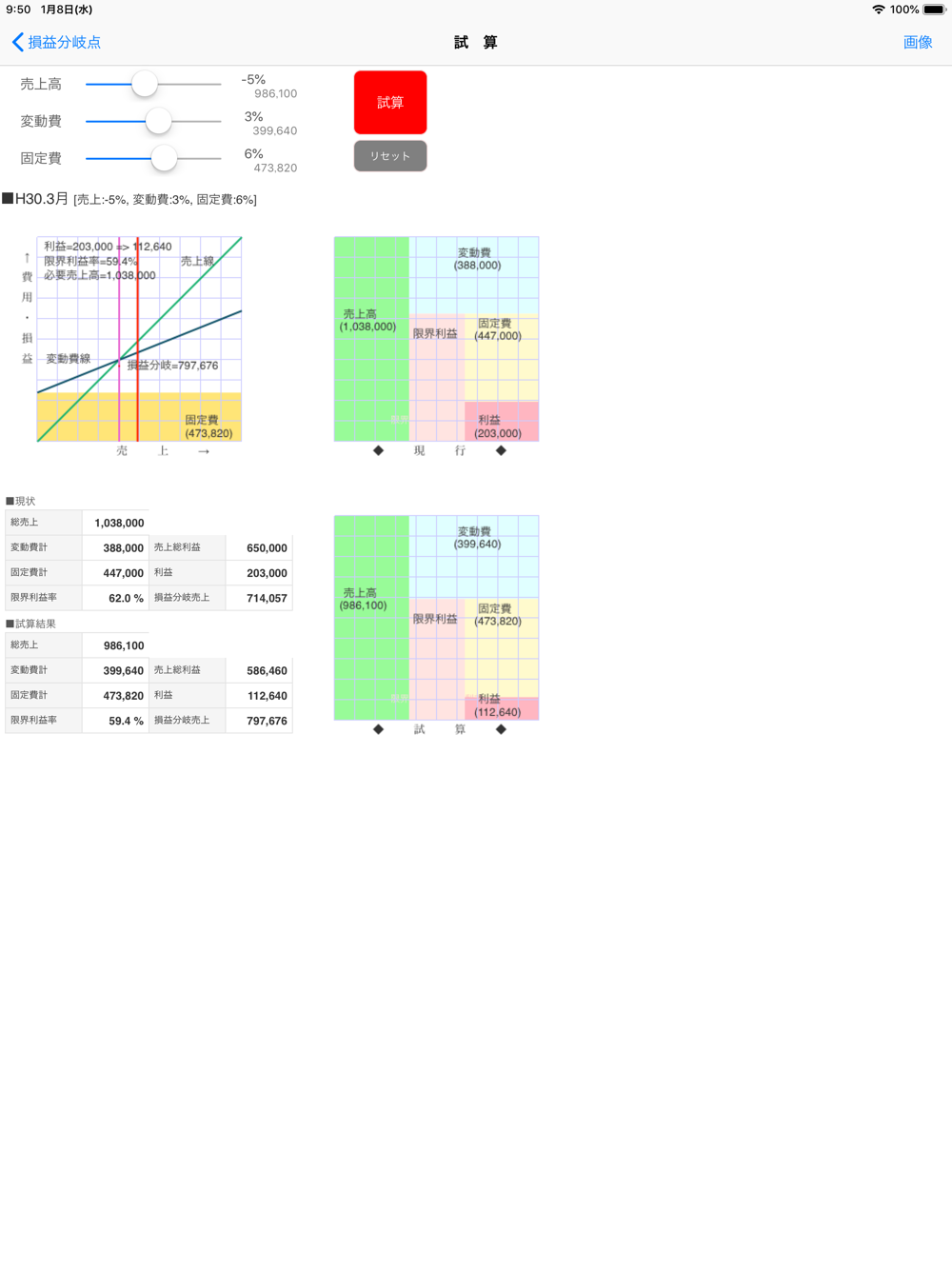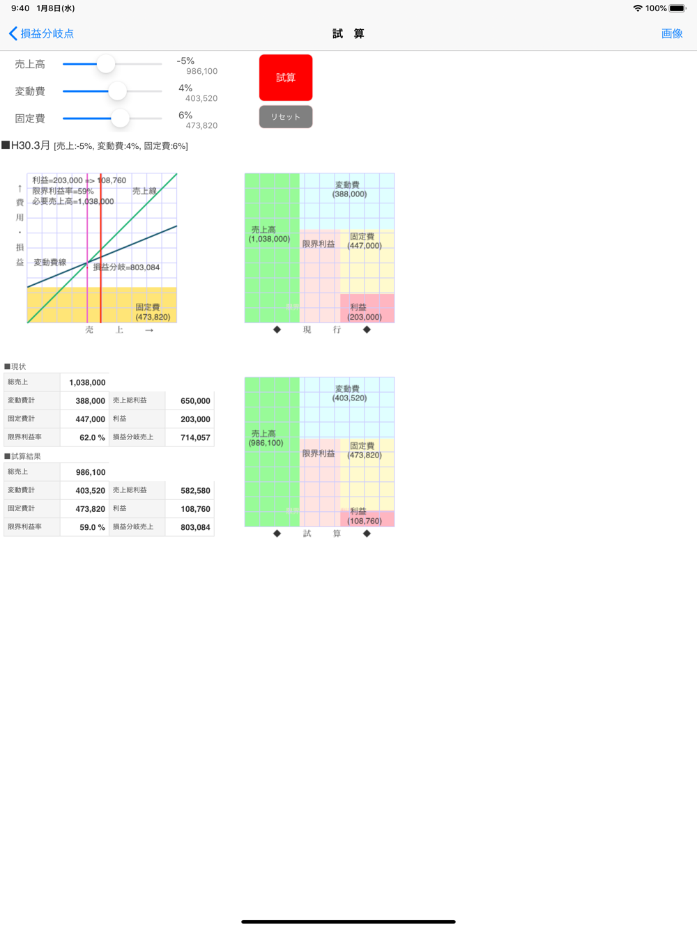 保存した目標・実績を基に、売上・変動費・固定費の増減指定により、利益試算できる機能をもっています。