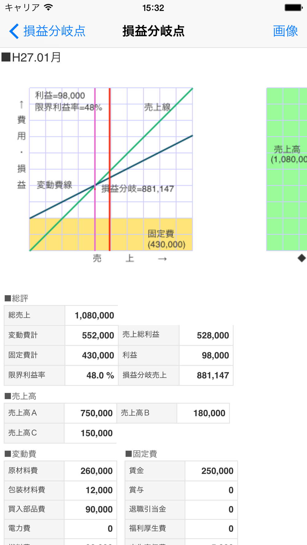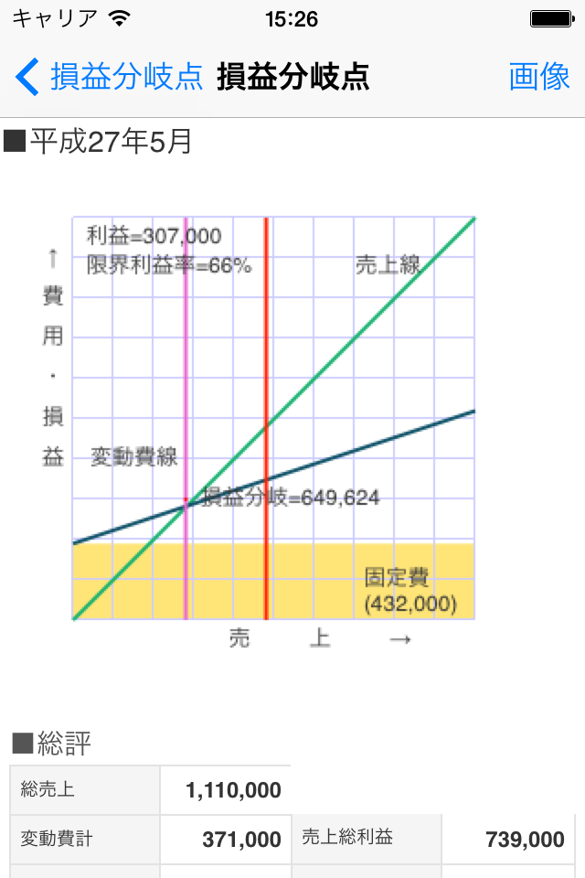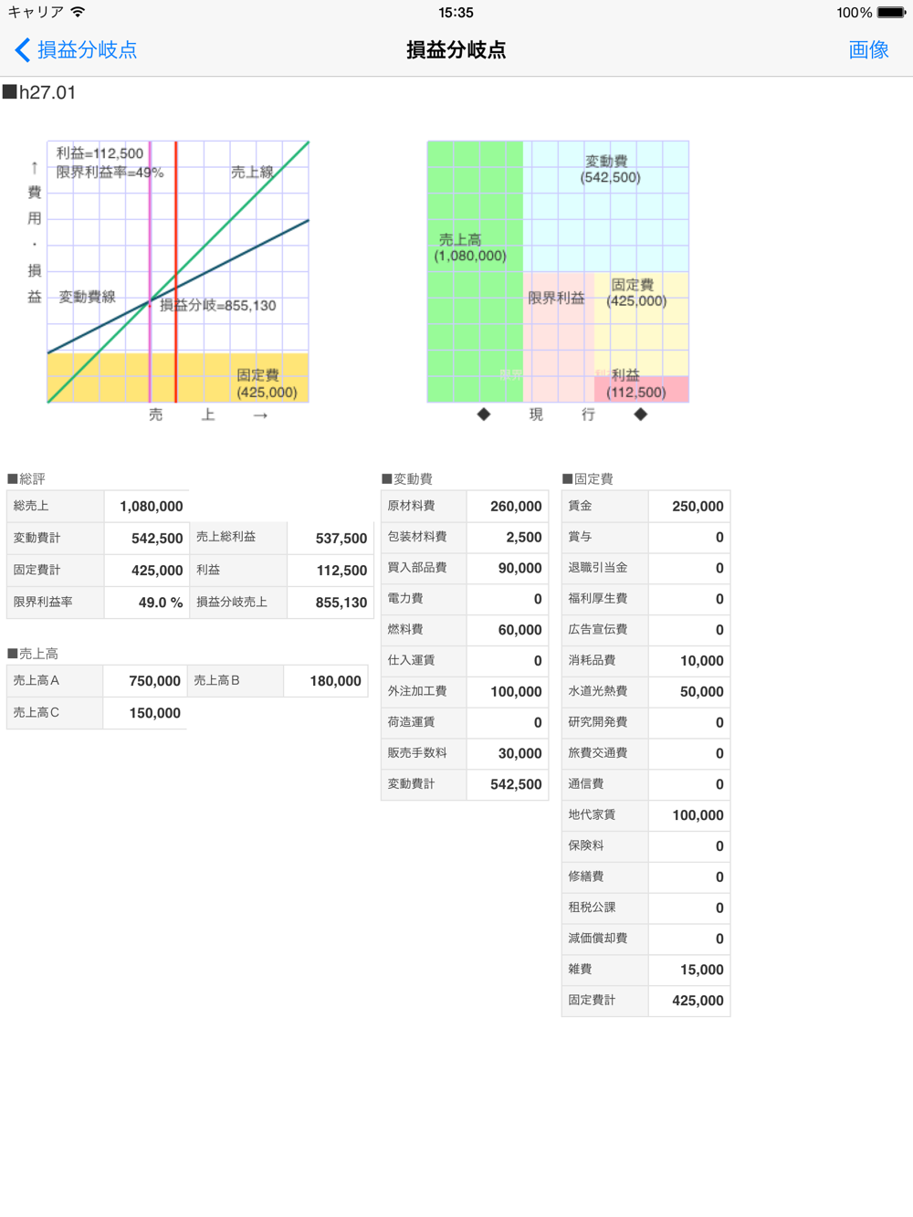 損益分岐点グラフと目標・実績データの総評が表示されます。