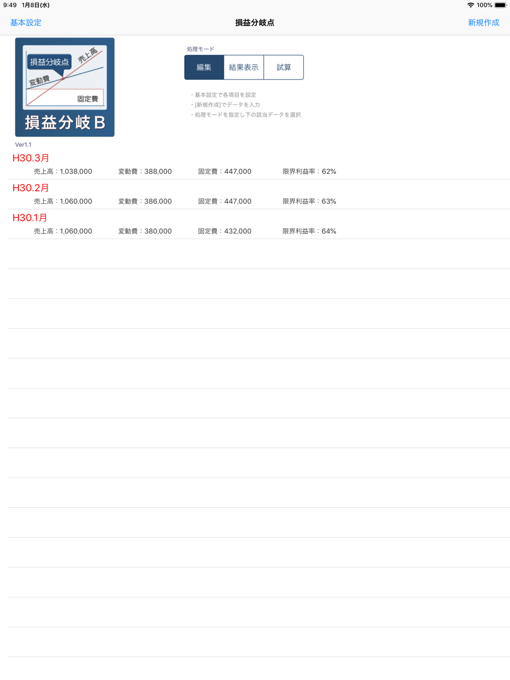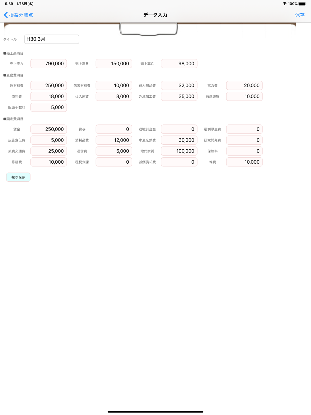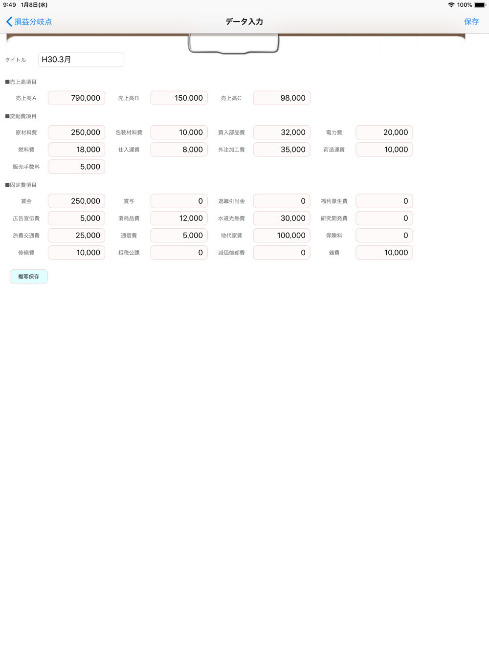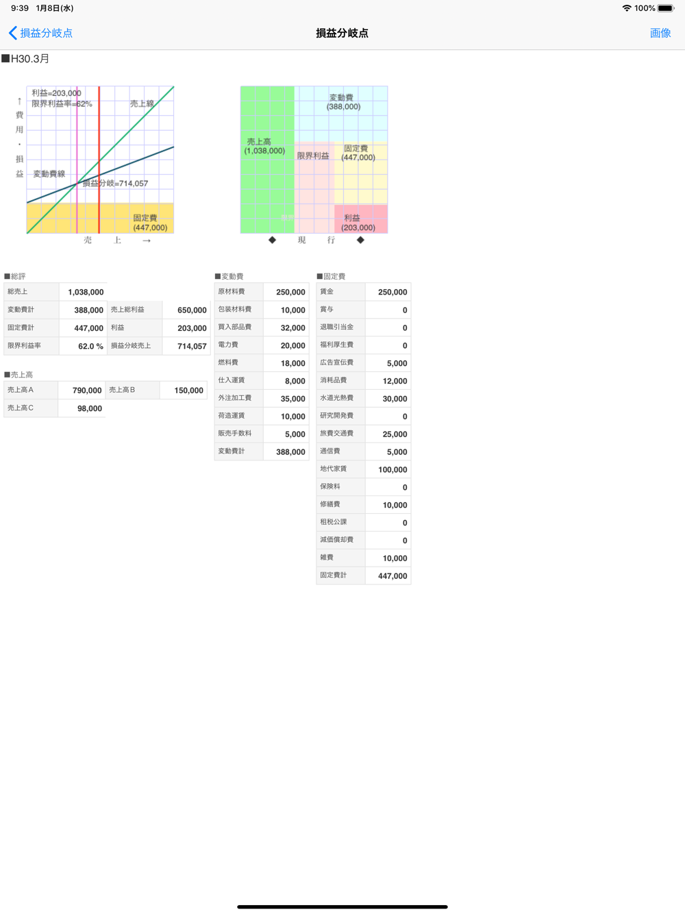 「損益分岐B」アプリは、目標あるいは実績の売上・変動費・固定費項目を入力することで、損益分岐点を算出・表現するアプリです。