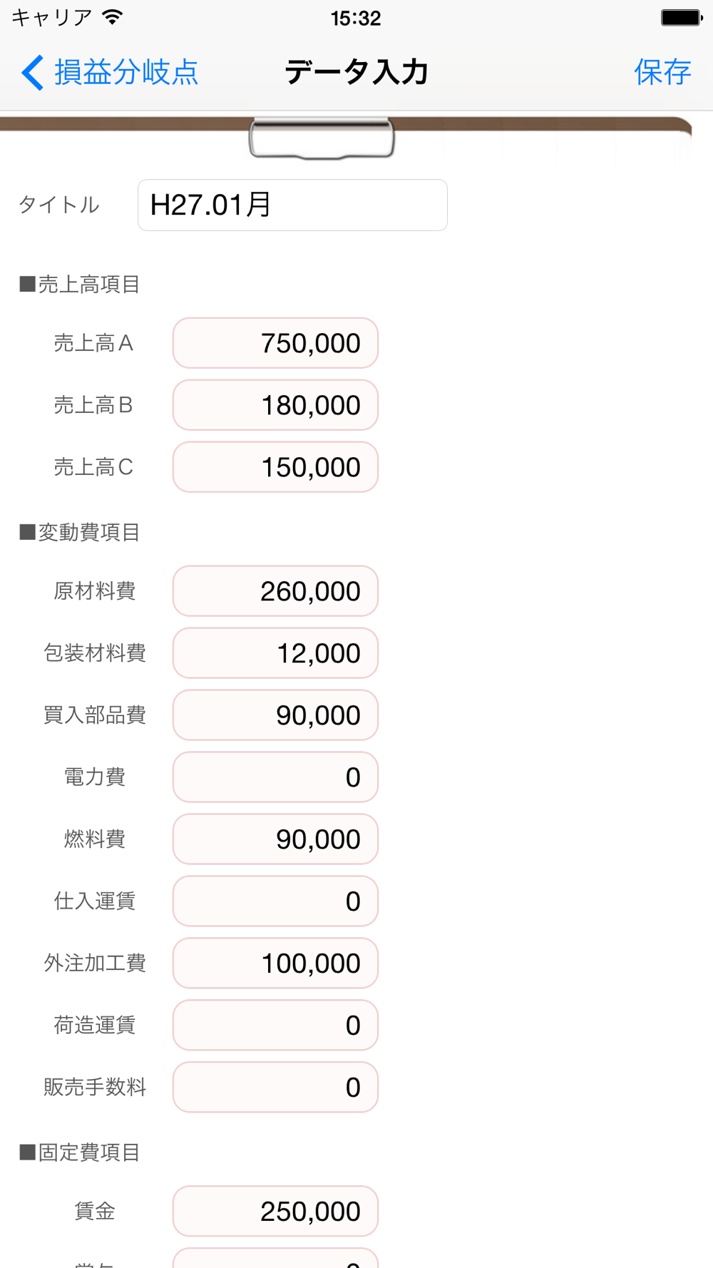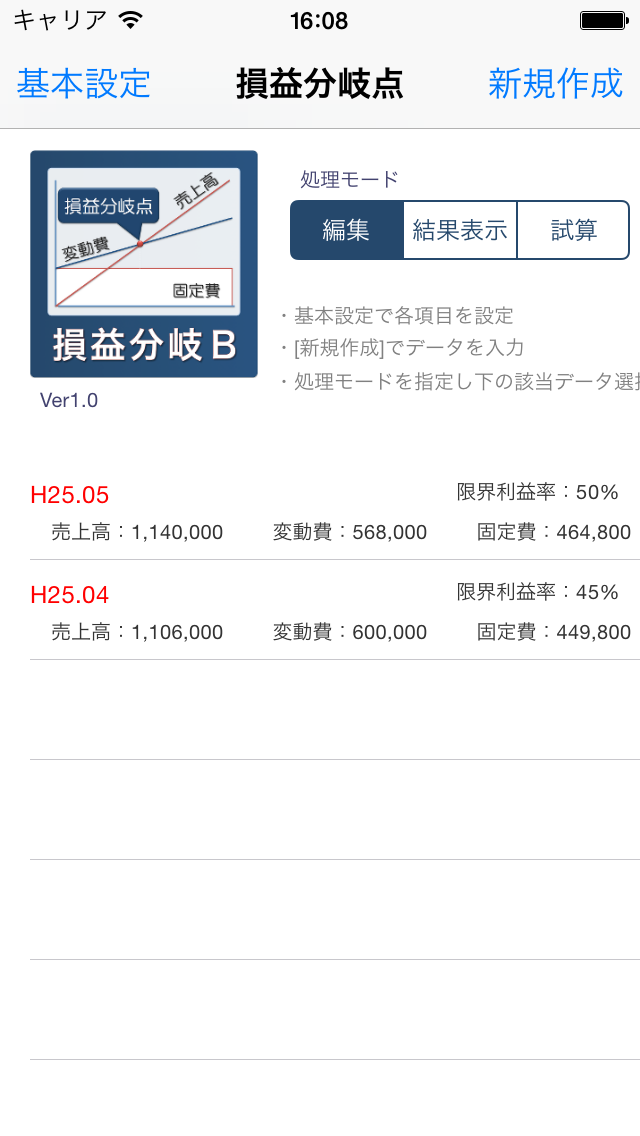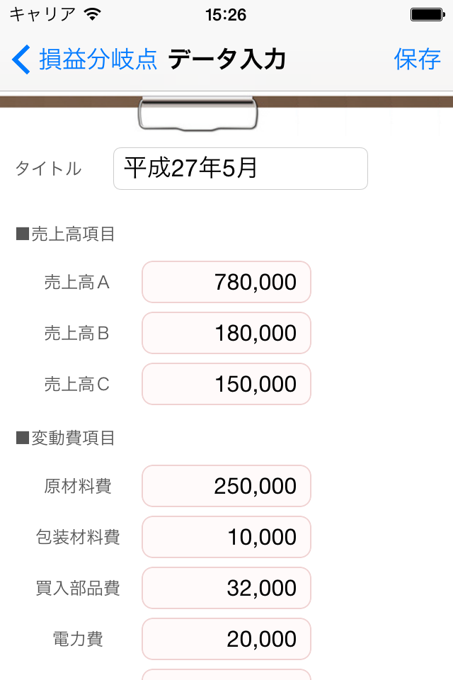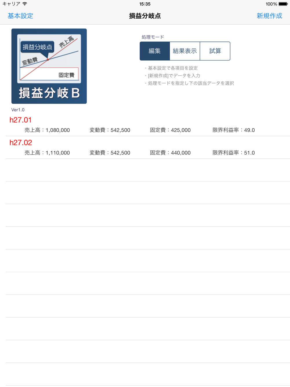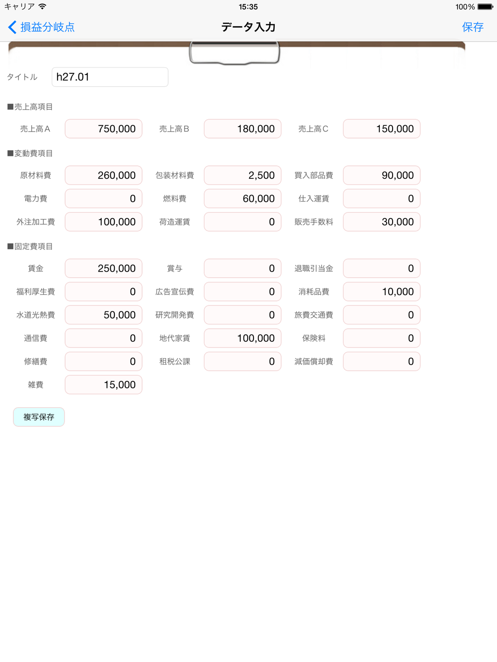 「損益分岐B」アプリは、目標あるいは実績の売上・変動費・固定費項目を入力することで、損益分岐点を算出・表現するアプリです。
