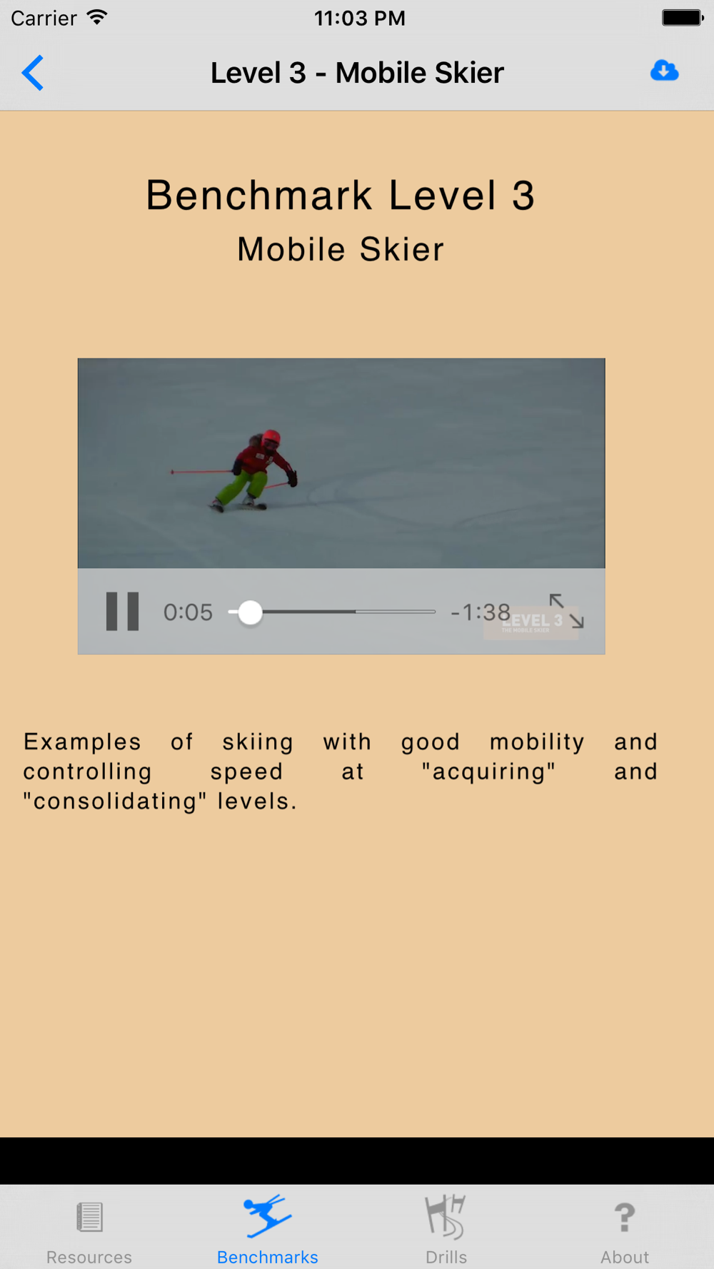 Benchmarks – this section shows video of the GOLD standard final form for each of the seven (7) Snow Stars skill levels, from the “controlled skier” right through to the “competitive ski racer”.
