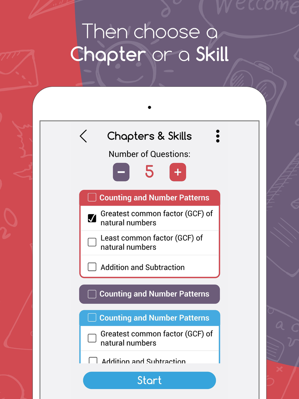 It allows you to log in to the app and start your exam in two steps. All you have to do is choose your grade level and the subject you want to be quizzed in, and then choose the specific chapter or skill. You can also view a detailed report showing strength and weakness points, power ups & rewards will be also be available, in addition to the “Link Devices” button that will allow the parent to control the kid’s device from her phone.