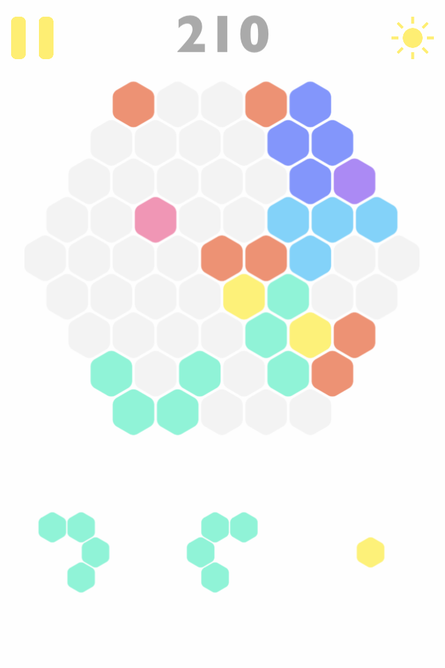 Create and destroy a complete hexagon on the screen by dragging and dropping the blocks to the board.