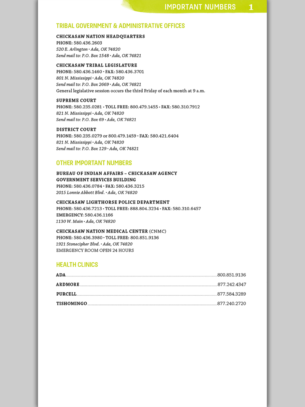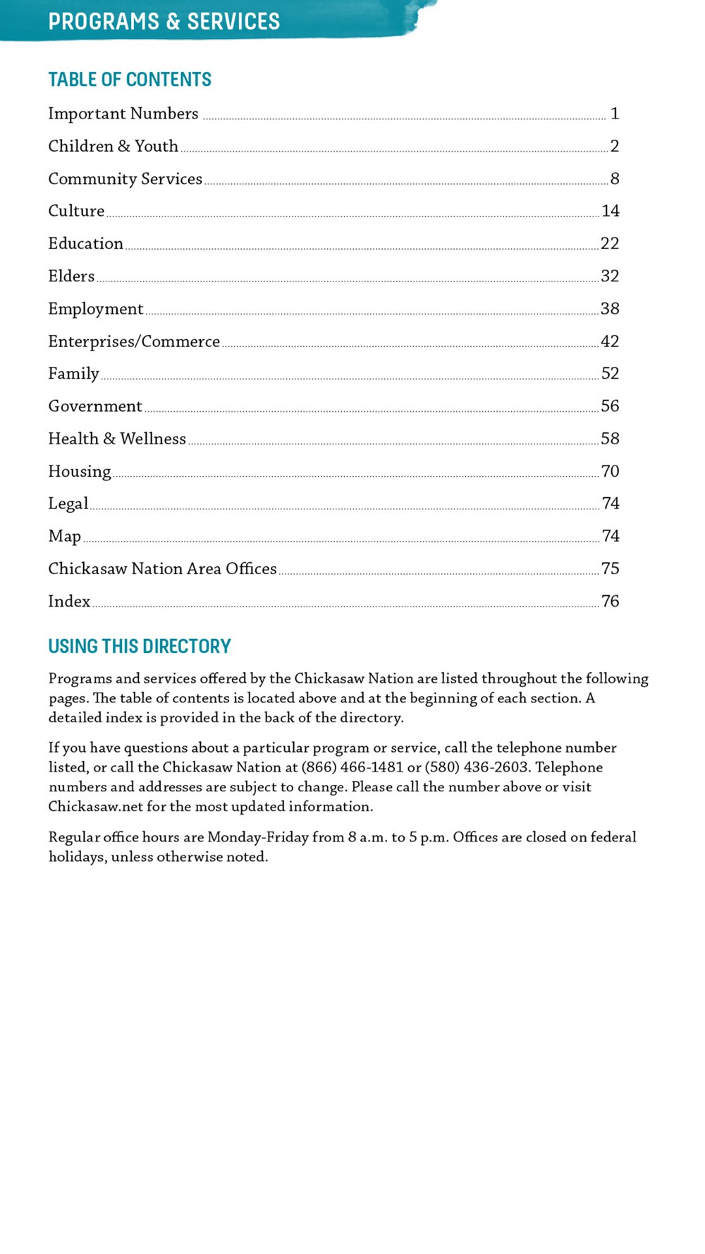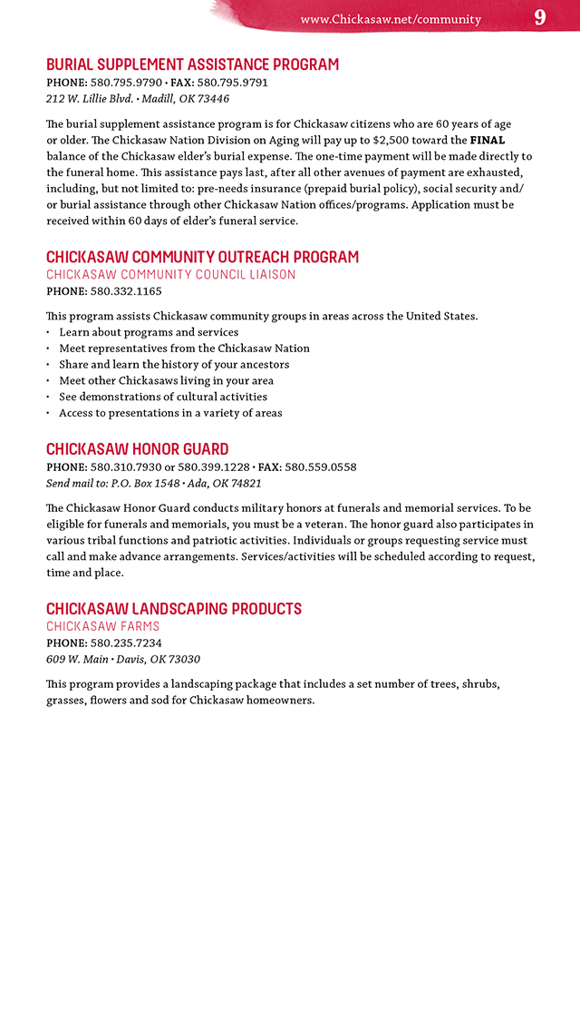 Chokma! The Chickasaw Nation brings you the electronic version of the Programs & Services Directory for Chickasaw Residents (citizens or other Native Americans living within the Chickasaw Nation boundary).