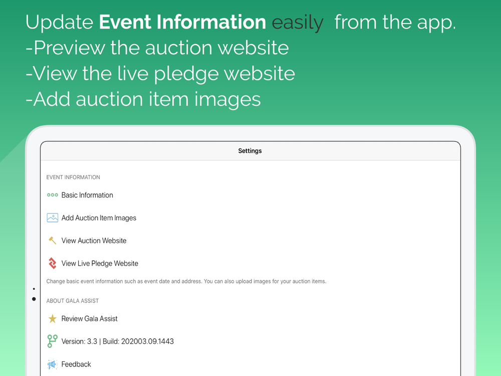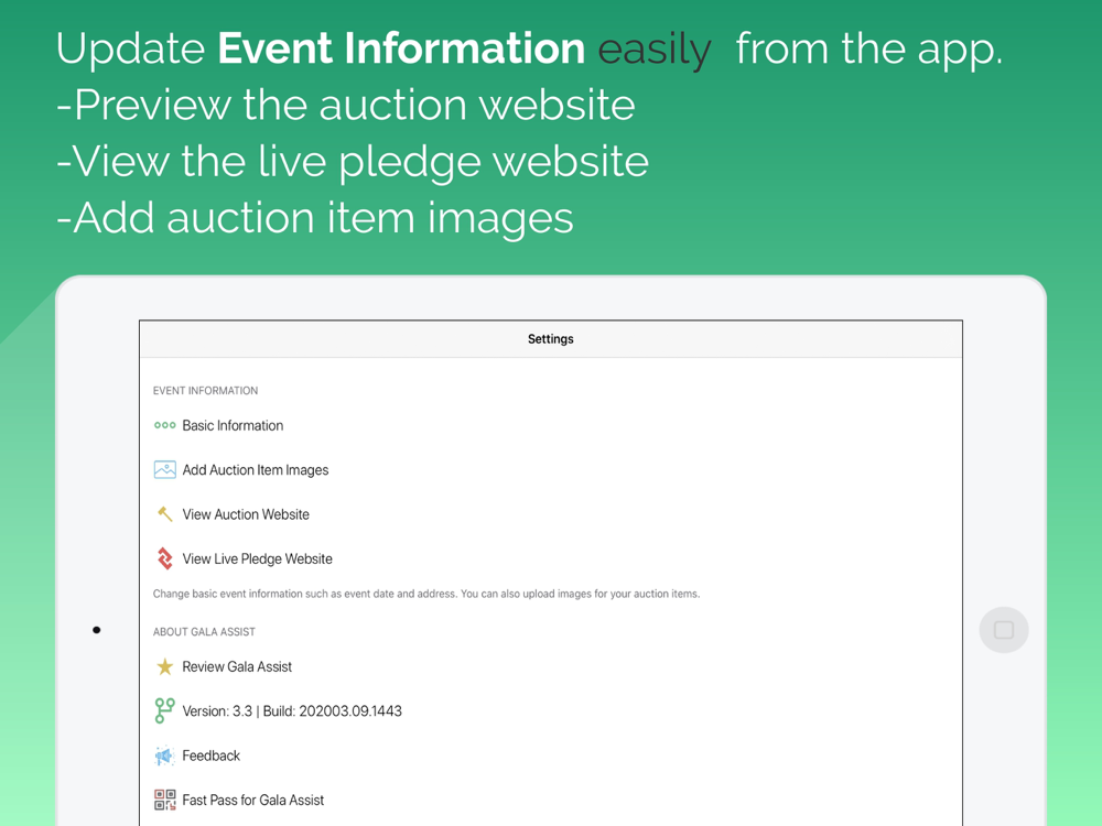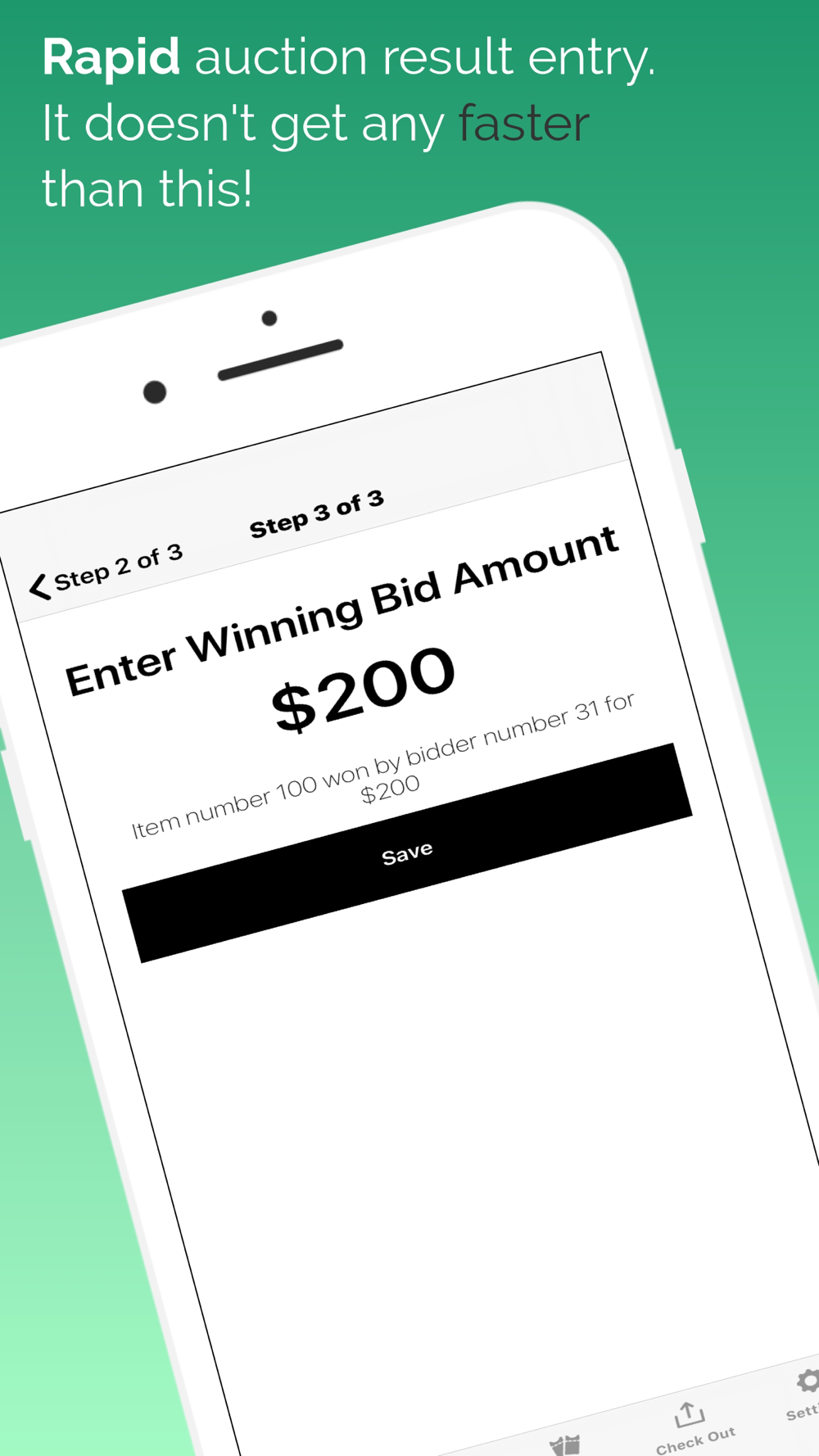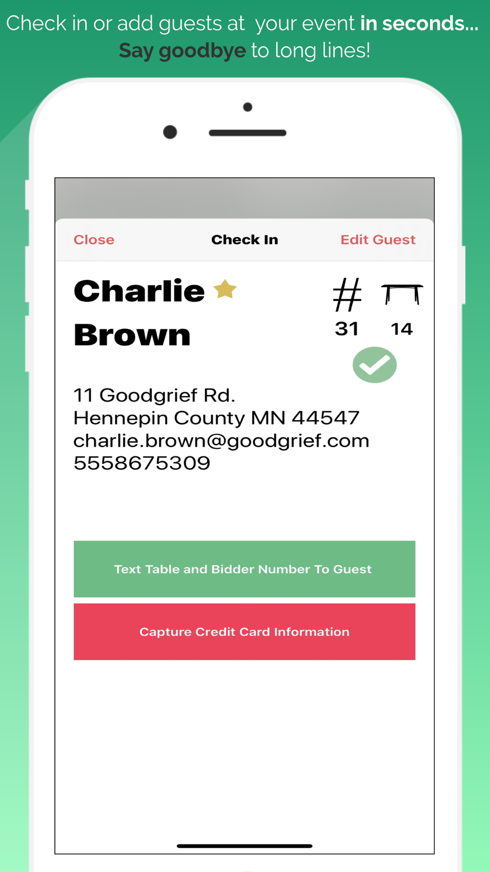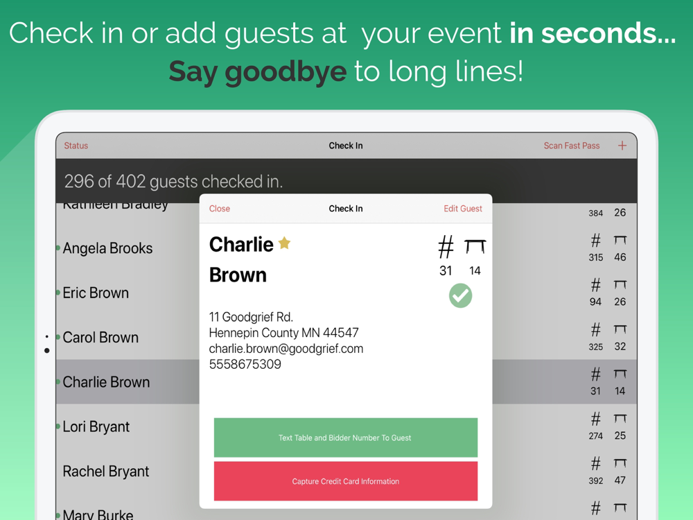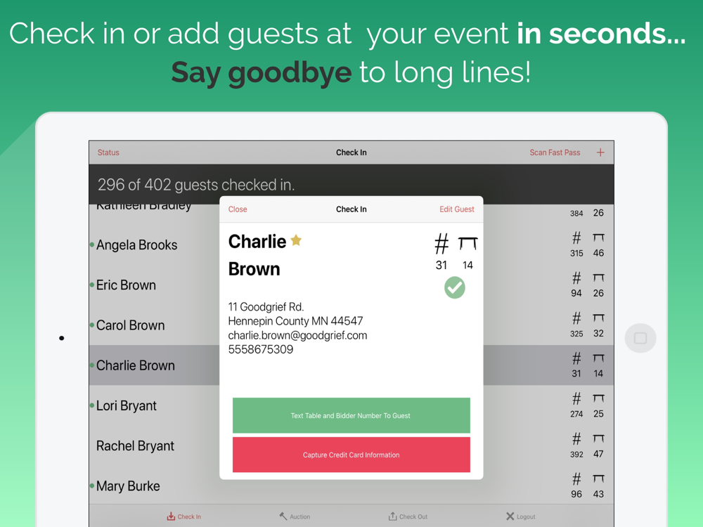 Enter your auction item result quickly and with confidence and when you are done simply press a button to let your guests know with a text message you are ready to check them out. Enter live auction results and pledges live within the app. It doesn't get any faster than this.