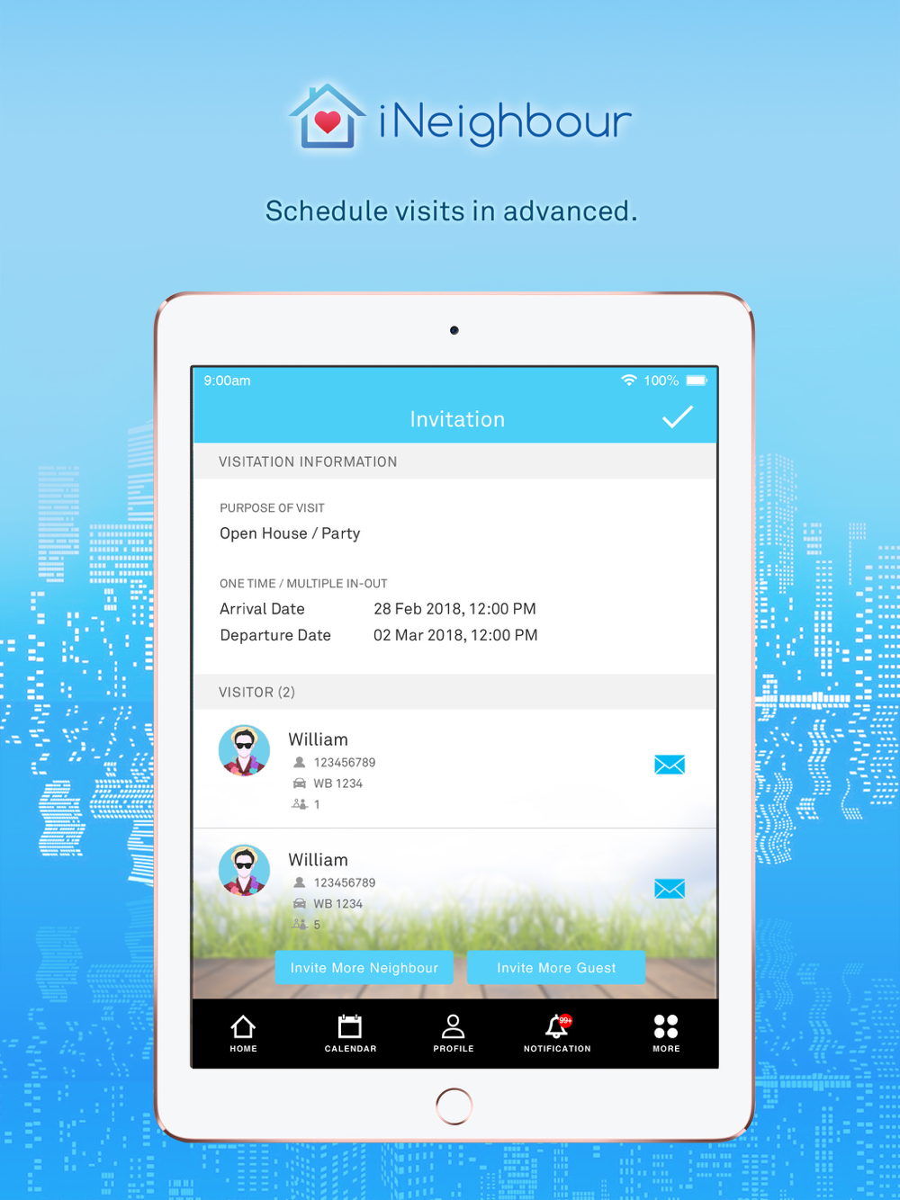 iNeighbour is designed with a simplified dashboard that contains all essential features that modern residential lifestyle demands, like pre-register visitors, e-billing, facility booking, feedback/ Inquiry, e-forms, e-documents, panic button and many more.