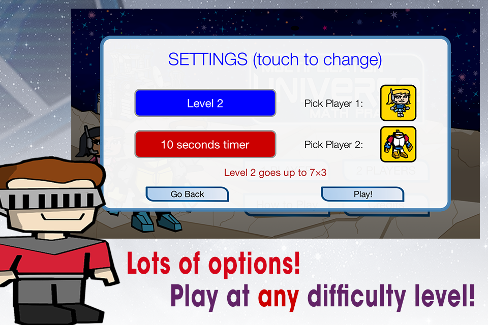 Become the hero of the galaxy by practicing your multiplication skills! Advance across the board and answer as many questions as you can. Play against the computer or against a friend.