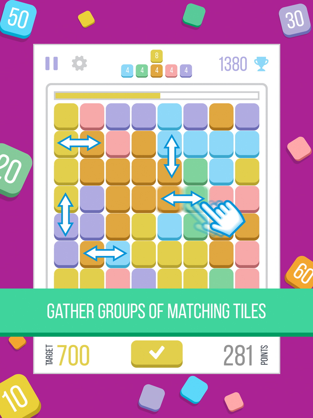 Simply group together at least three matching tiles, then hit the gather button to convert these groups into points which can win you some app-etizing desserts*. Be quick though as you're against the clock.