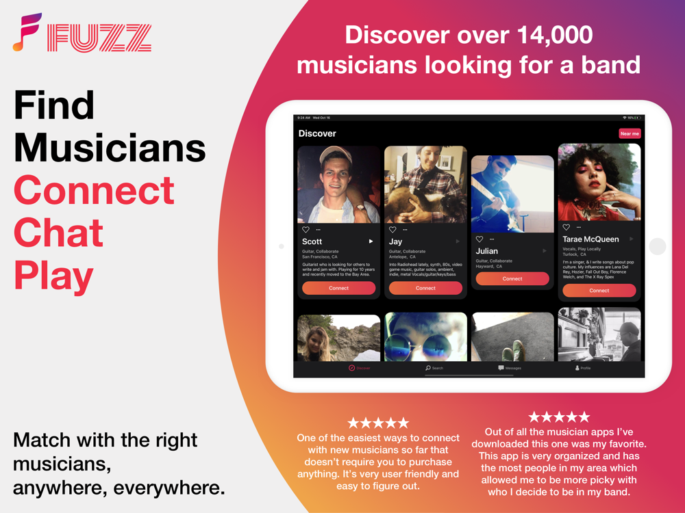 FUZZ makes it easier than ever to search, discover, connect and play with other musicians. Whether you’re a singer looking to collaborate with someone for the first time or an established band looking for a new drummer, FUZZ will help you find your bandmates. Get started by setting up your profile, selecting your instrument, adding your songs, and browsing for other musicians. Your bandmates await!