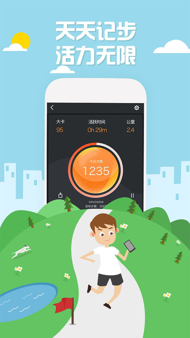 健康计步器,你的减肥瘦身神器!通过高灵敏的重力传感器精准记录用户的行走或跑动次数,准确测量卡路里消耗,有效的提高运动质量。