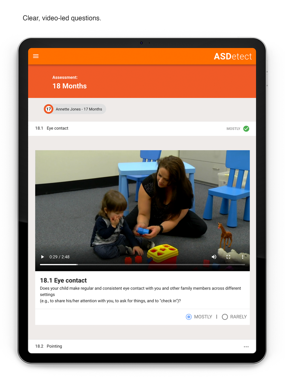 With actual clinical videos of children with and without autism, each question focuses on a specific ‘social communication’ behaviour, for example, pointing, social smiling.