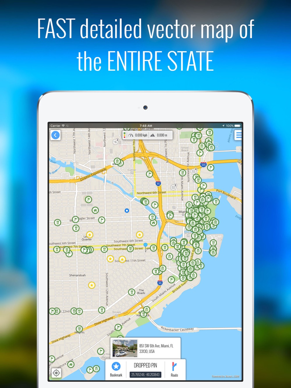 Maps for the entire state, and travel content for Houston are included for free when you download the app. Travel content for every other city is available through In-App Purchases.