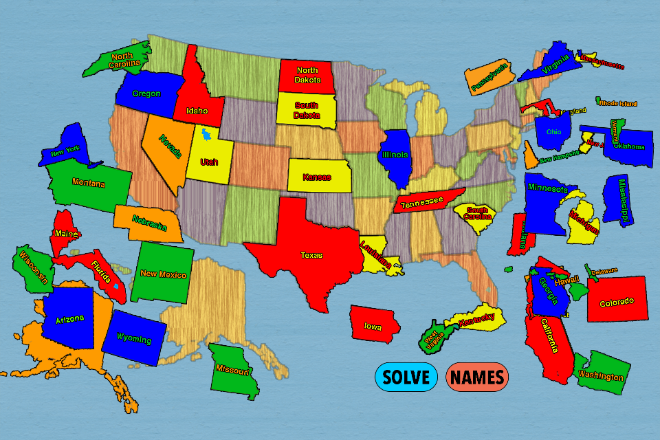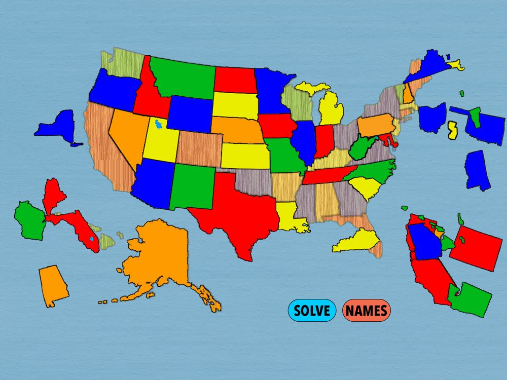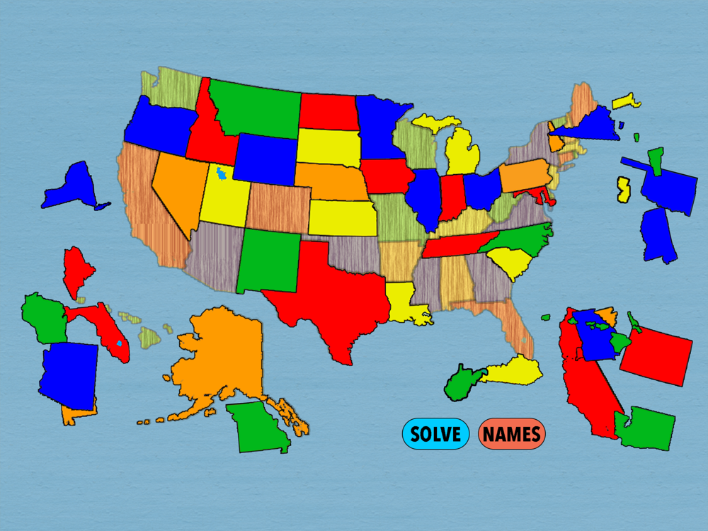 A solve button will place the states in their approximate location to assist a child having a difficult time finding the location.