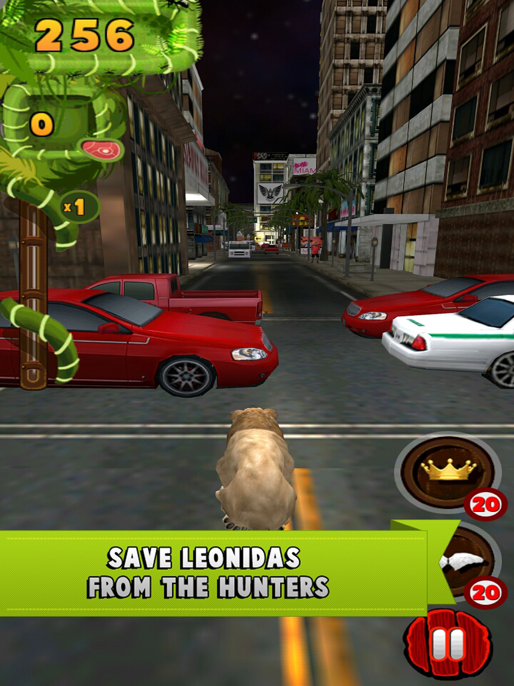Leonidas: The Paraval Lion is a 3D gaming app. The app features you as the lion running away from hunters. Leonidas has different attributes, you can get wings that allow you to fly over objects as well as a crown to collect meats as you go about the stages. There are a total of three different stages which cover his story from Jungle to City. He has to avoid animals, people, rocks and trees. All along he is chased by the hunters in their jeep who want nothing more than to capture Leonidas and put him in a cage. So it can be more important for you to help him escape in the Jungle, Desert and City Stages. You will have some help though in the form of wings and crown super powers. You can collect both these items through out the stages by collecting two parts of each item. Once you complete all the 3 stages and collect enough meat you can unlock the ending of the game and succeed in helping Leonidas escape.