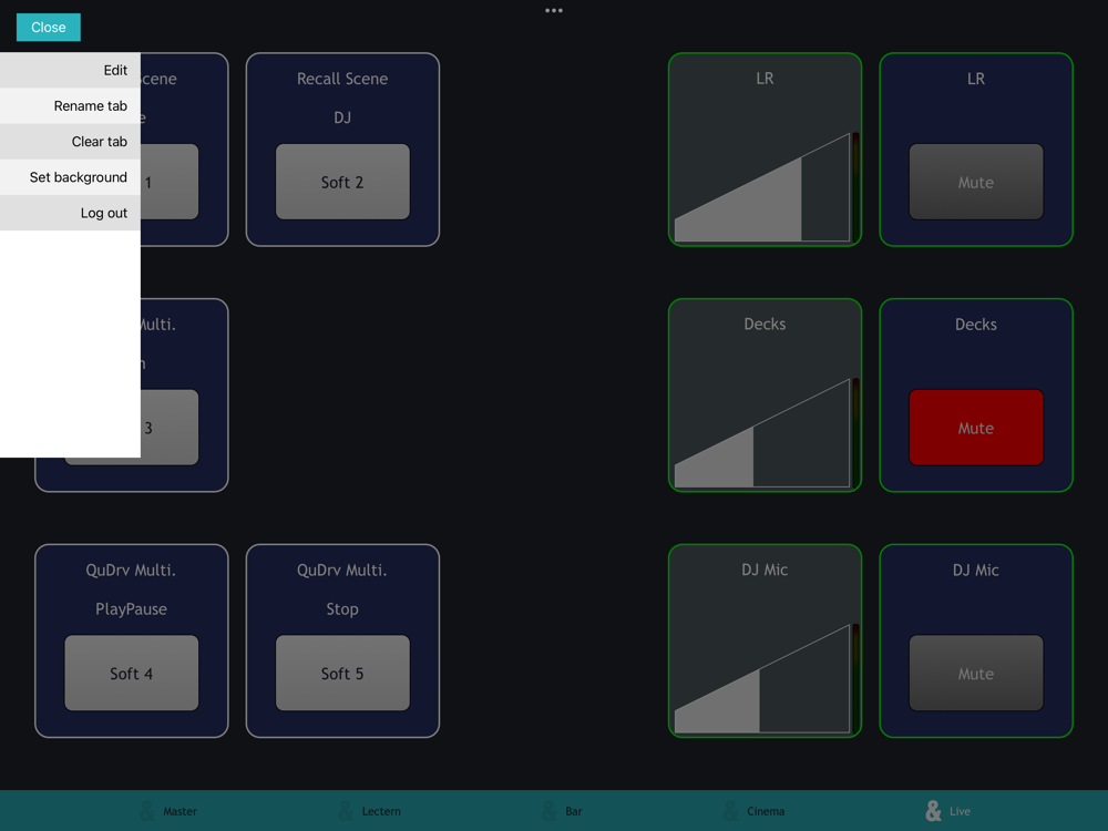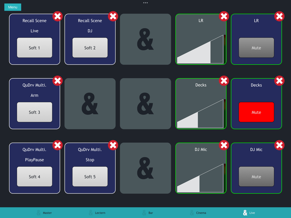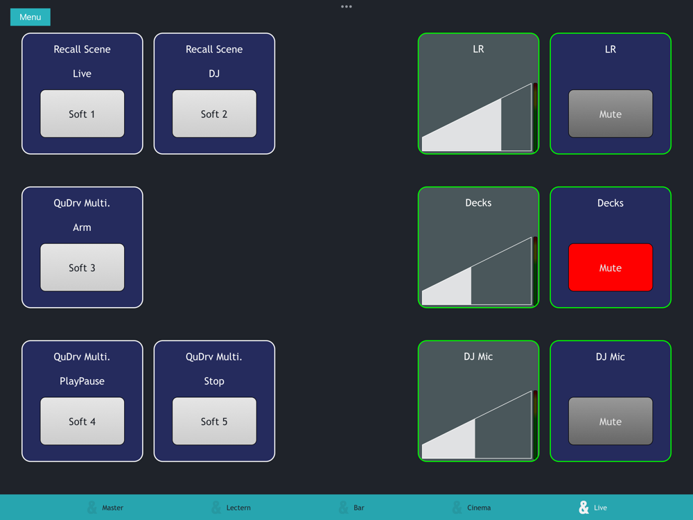 Qu-Control works simultaneously with Qu-Pad and the Qu mixing consoles.Complex set-up of routing, levels and processing are carried out within the mixing console or Qu-Pad by an experienced user, then Qu-Control can be configured and used by non-technical users or when only a few parameters require adjustment.