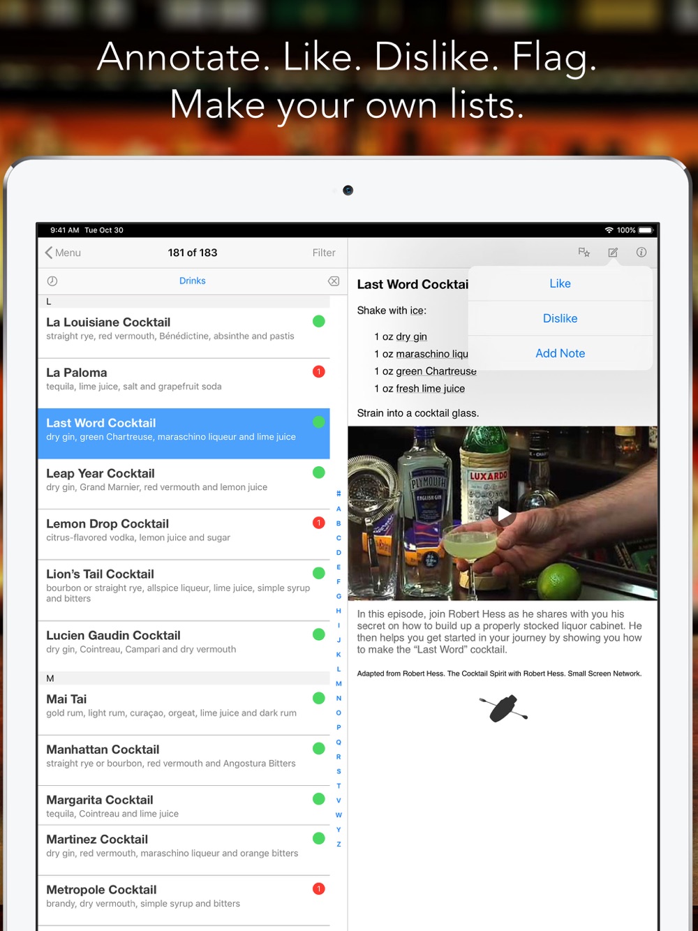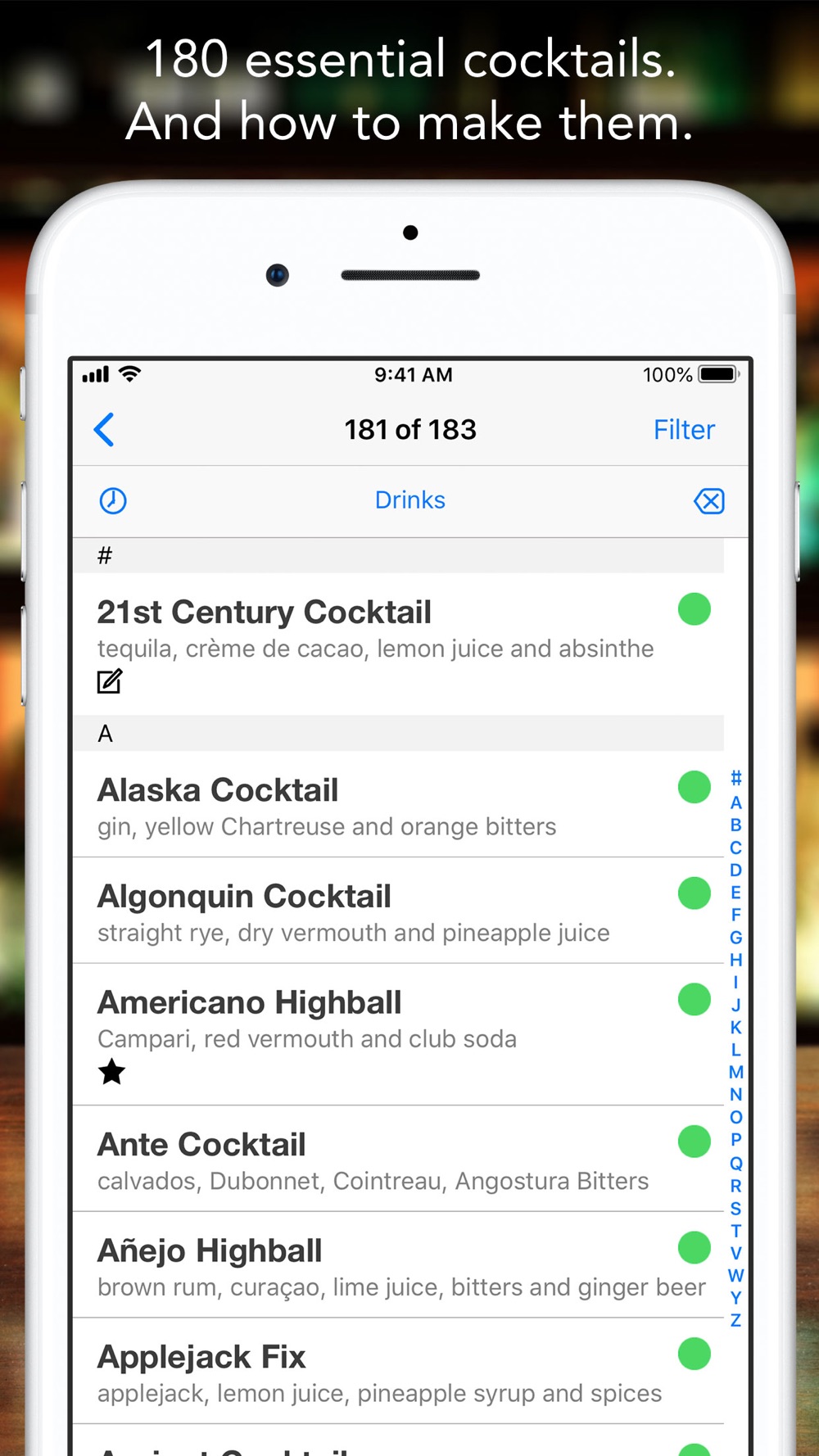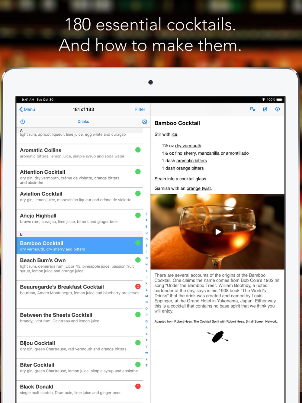 - includes 180 expert-curated drink recipes; mostly “classic cocktails”, but some newer ones