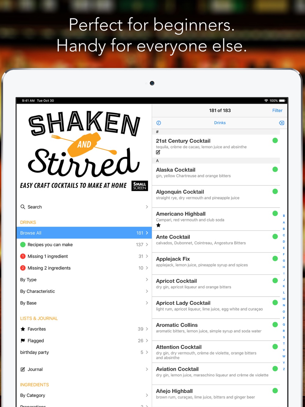 Shaken and Stirred is a carefully curated collection of nearly 200 easy, delicious craft cocktails to make at home. Each recipe has a tutorial video from Small Screen. Moreover, you can input your ingredient inventory and the app will show you which drinks you can make!