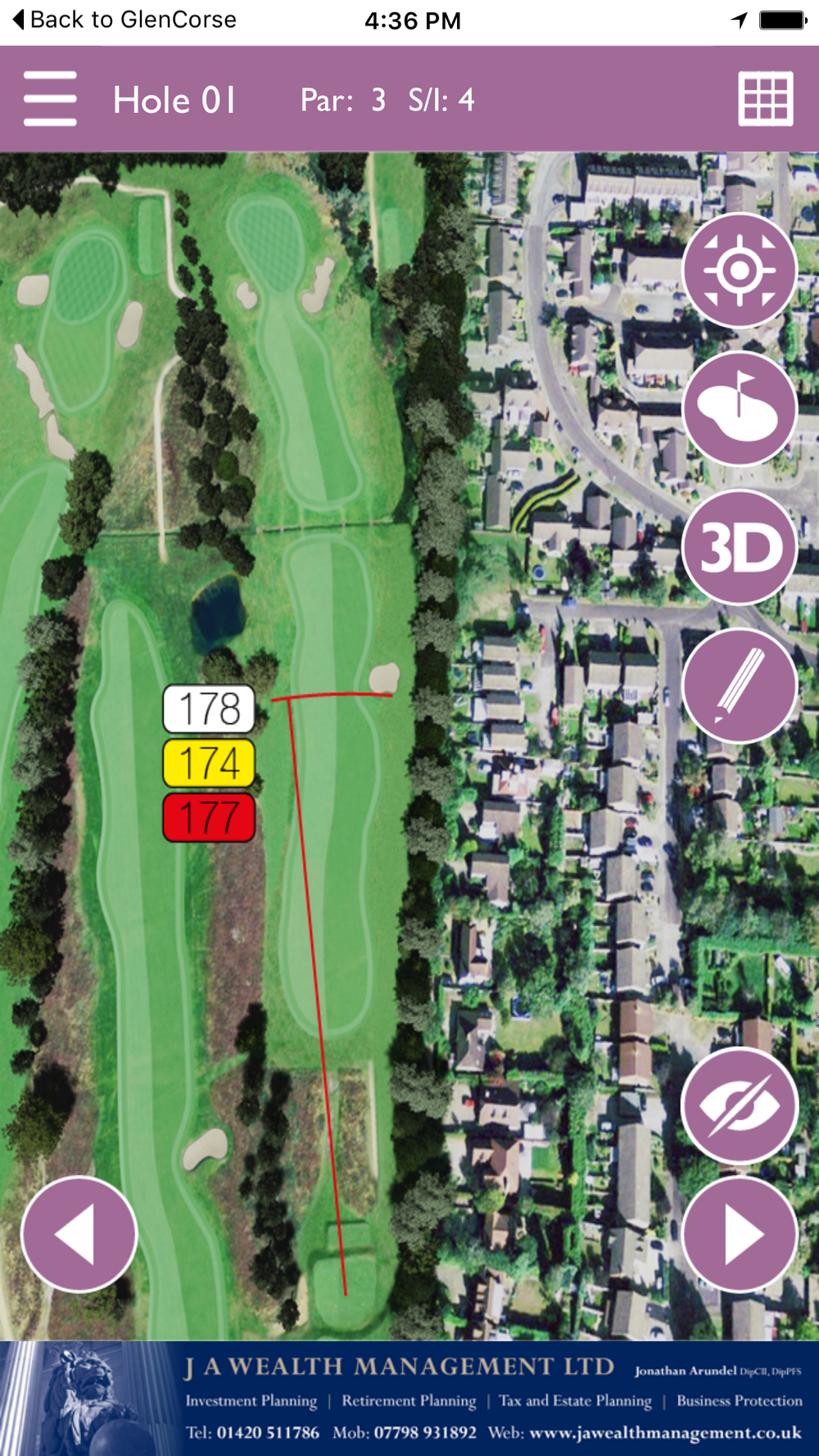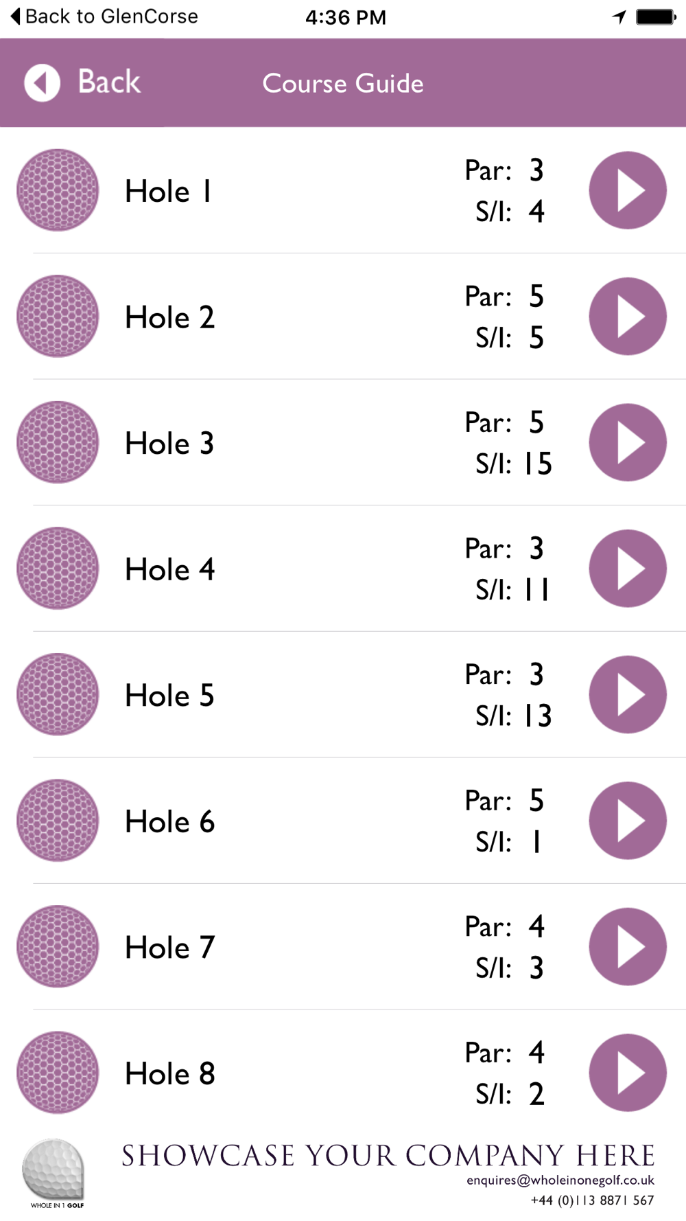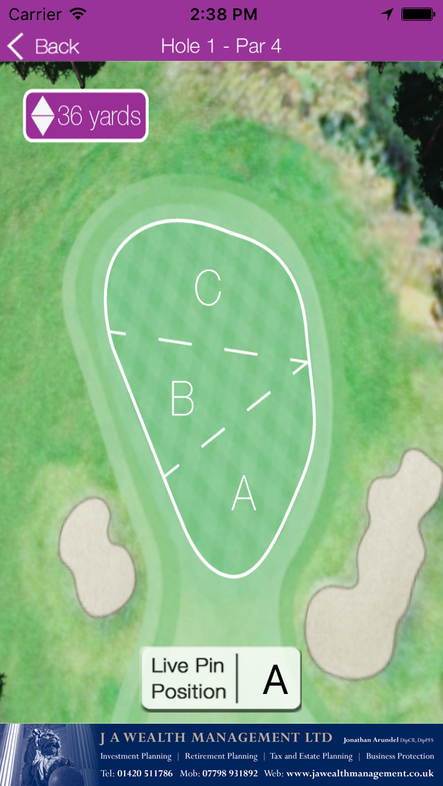 The app features the Whole in One Golf GPS Range Finder and Digital Guide to playing the clubs 18 hole golf course. The App works as an virtual aid, giving you a 3D Flyover of each hole, a pin positioning system.