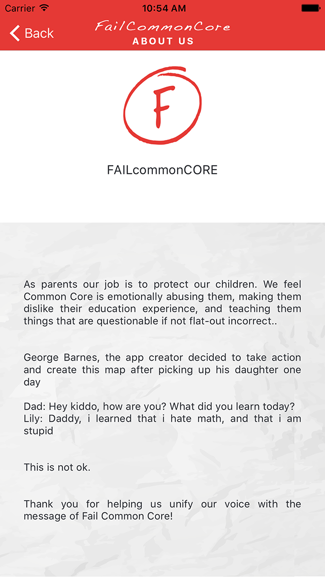 The "Common Core" curriculum is harming our children every day it being taught in our schools. This app was created by a father, frustrated by the absurdity of this method of teaching.