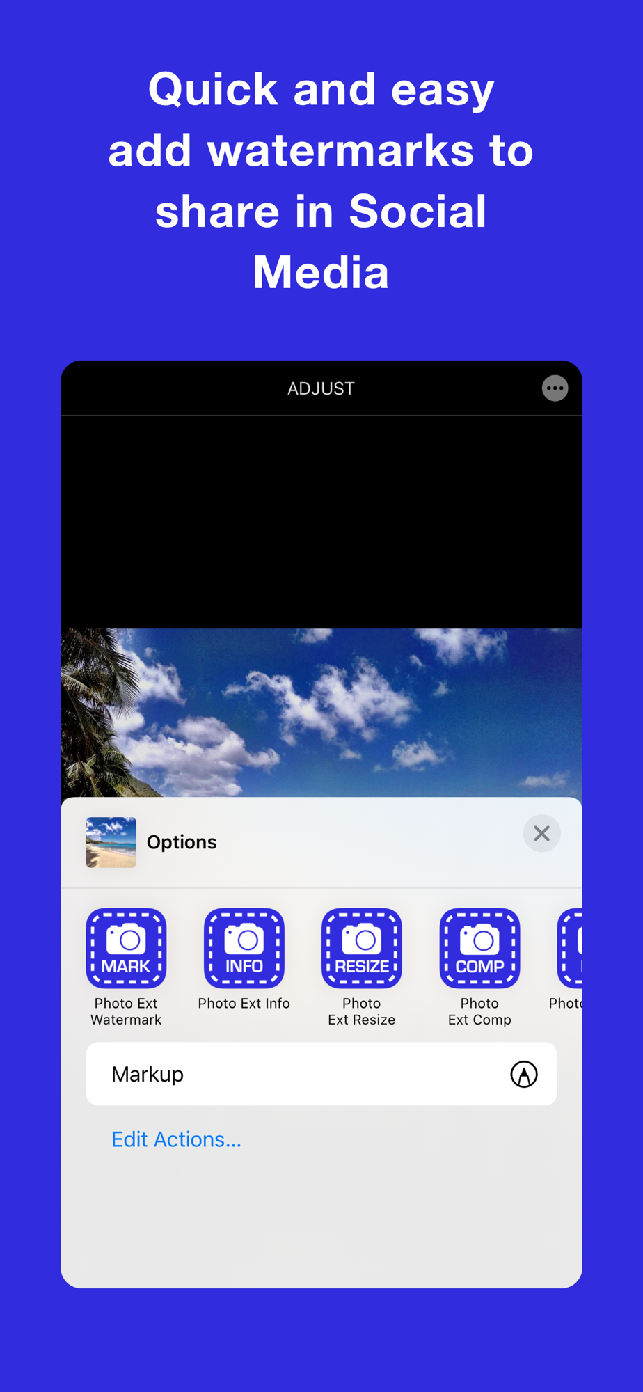 Photo Extension Watermark lets you add a watermark to photos stored in the Apple Photos app for iPhone and iPad. This extension is great for photographers who want to share photos with clients and want to brand the photos, on social media like Facebook, Instagram, Pinterest, and more, and want to protect their photos or just label photos with important information. The extension makes a copy of the photo with the watermark in the Apple Photos Library.