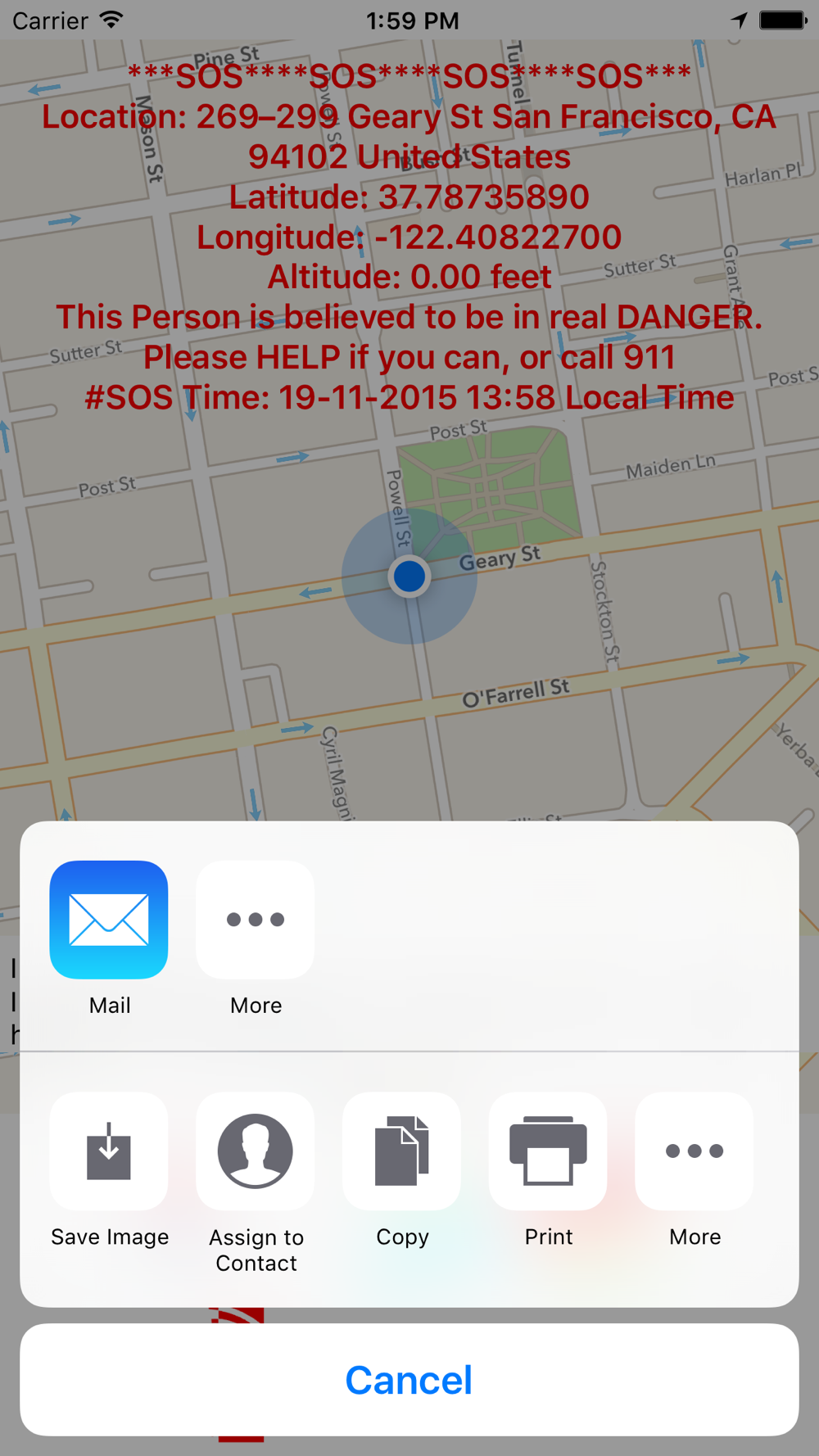If you are in a case of emergency and you can't call for help. Let the world knows about it, simply share your location information via Text, Mail, Facebook, Twitter, and/or other supported social media.