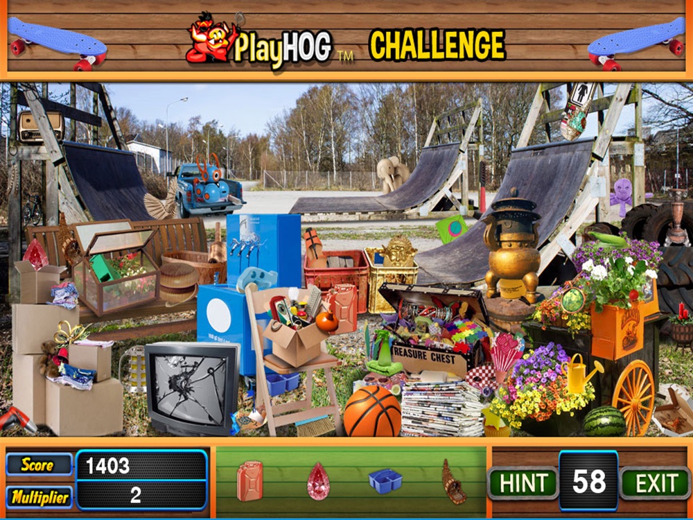 PlayHOG presents Skate Park, one of our newer hidden objects games where you are tasked to find 5 hidden objects in 60 secs. Your score is tied with a multiplier that increases as you find the right hidden objects, but beware, make a mistake and it will reset to 1. Try to get the highest score as you try to find all 400 hidden objects in Skate Park.