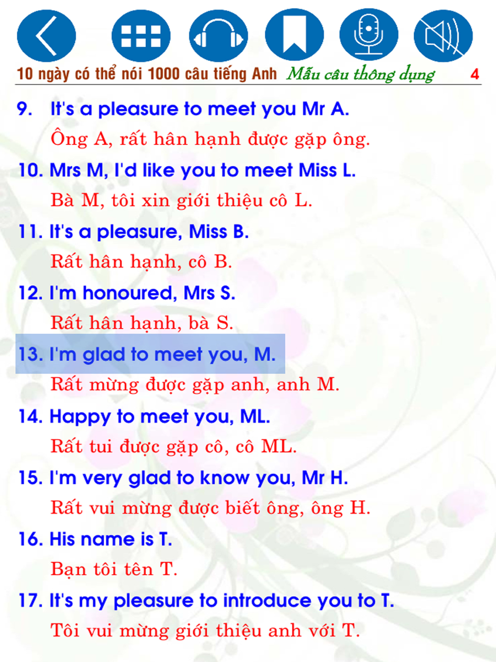 Quyển sách “10 ngày có thể nói 1000 câu tiếng Anh – Mẫu câu thông dụng (In 10 days can say 1000 English Sentences – Common Sentences)” gồm 146 trang được thực hiện theo tiêu chí “Học tiếng Anh mọi lúc mọi nơi” khi trong tay có chiếc điện thoại thông minh. Bản thân sách SmartBooks của chúng tôi đã rẻ hơn sách giấy nay chúng tôi giảm thêm giá bán SmartBooks để kích cầu đọc sách và sử dụng sách Smartbooks trong kỷ nguyên số hiện nay. Sách được tích hợp âm thanh (audio) vào trong sách, đánh dấu từng câu khi đọc, khi cần nghe lại câu vừa mới đọc hay câu nào đó thì bạn chỉ cần chạm tay vào câu đó thì sẽ phát âm thanh; Ngoài ra SmartBooks còn có tính năng thu lại giọng đọc (giọng của bạn tập đọc câu vừa học, vừa nghe) của bạn bằng cách nhấn vào nút Recorder (icon Micro), khi bạn nhấn vào icon “Headphone”, “Nghe và viết”, xuất hiện màn hình có rất nhiều tính năng giúp bạn nghe và viết lại câu vừa nghe bằng phím hay bằng tay,… Sách được thiết kế để sử dụng mọi lúc mọi nơi khi trong tay bạn có chiếc Smart Phone. Đây là một bước đột phá của chúng tôi trong thời đại công nghệ số nó sẽ giúp các bạn rất nhiều trong việc học và đọc sách.