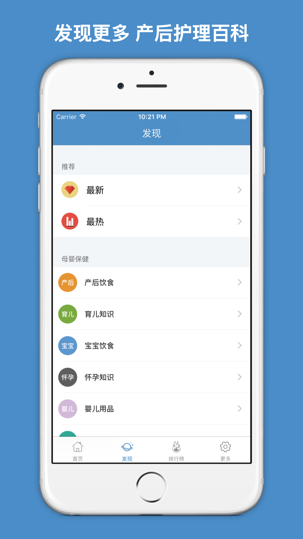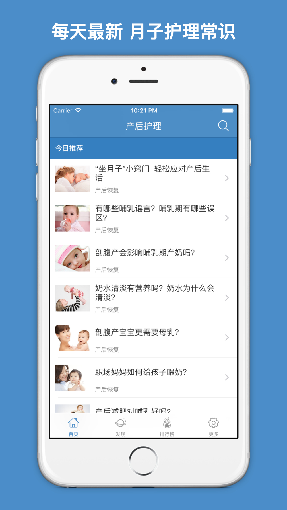 产后护理APP为产后的妈妈们提供最丰富的产后护理资讯,包括坐月子注意事项、产后饮食、产后减肥、产后恶露、产后抑郁症、哺乳等,助您快速恢复健康与美丽,成为人人称羡的漂亮妈妈~