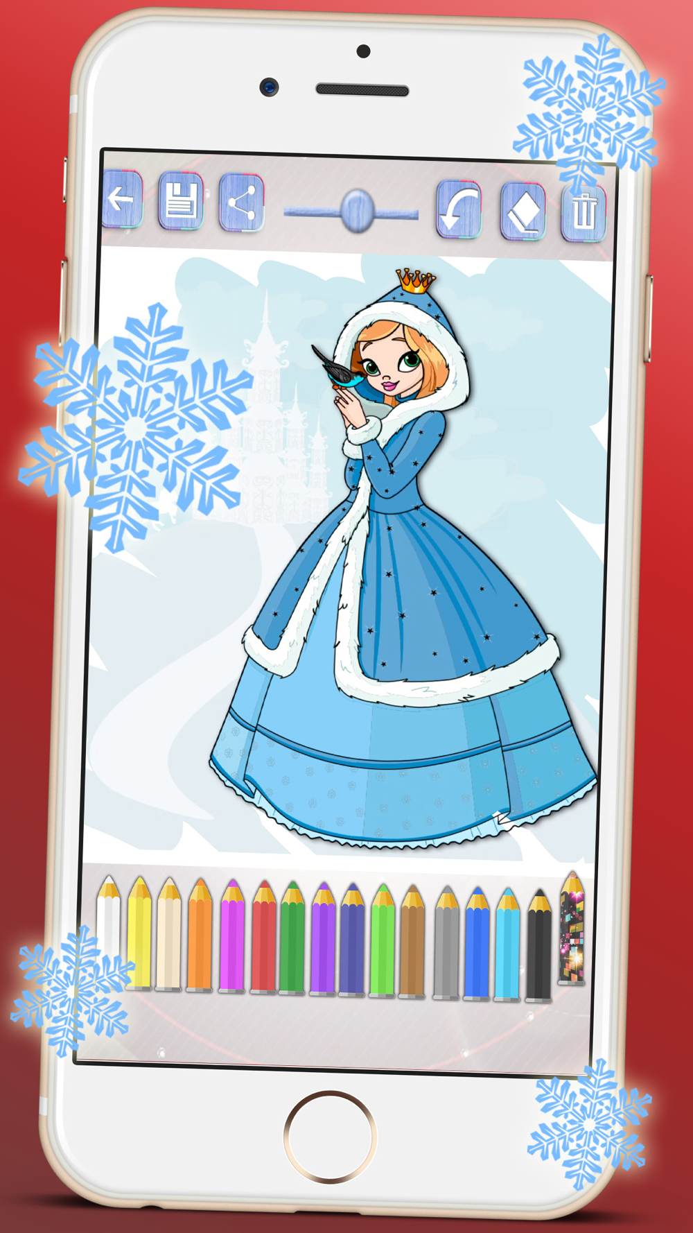 Celebrate Christmas like a real fairytale princess. Princesses coloring book during the Christmas holidays while waiting for the arrival of Christmas will bring Santa Claus on Christmas Eve. Paint beautiful princesses by the Christmas tree with her long braid, crowns and pretty dresses coming-to paint the belle of the ball this Christmas, you will see layers of clothing as you mom Claus or Mrs. Claus. Pinta precisely these precious tale princesses and coloring her beautiful costumes and princess dresses. No lack detail, the palace or castle, beautiful or handsome Prince Charming, the coach or carriage with the fairy godmother or horses or ponies, a variety of hairstyles, dresses and crowns for princesses paint or fashionable as sofia anna elsa with the magic pen, they can paint the picture automatically using the whole palette of colors like purple. They will love.