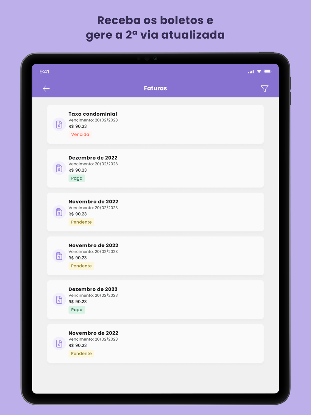 • FATURAS: Receba a taxa condominial pelo app e com 1 clique copie o código de barra para pagar em seu Internet Banking. Venceu? Sem problemas: gere a 2ª via e pague na hora! Chega de boletos em baixo na porta ou horas no telefone para gerar uma 2 via.