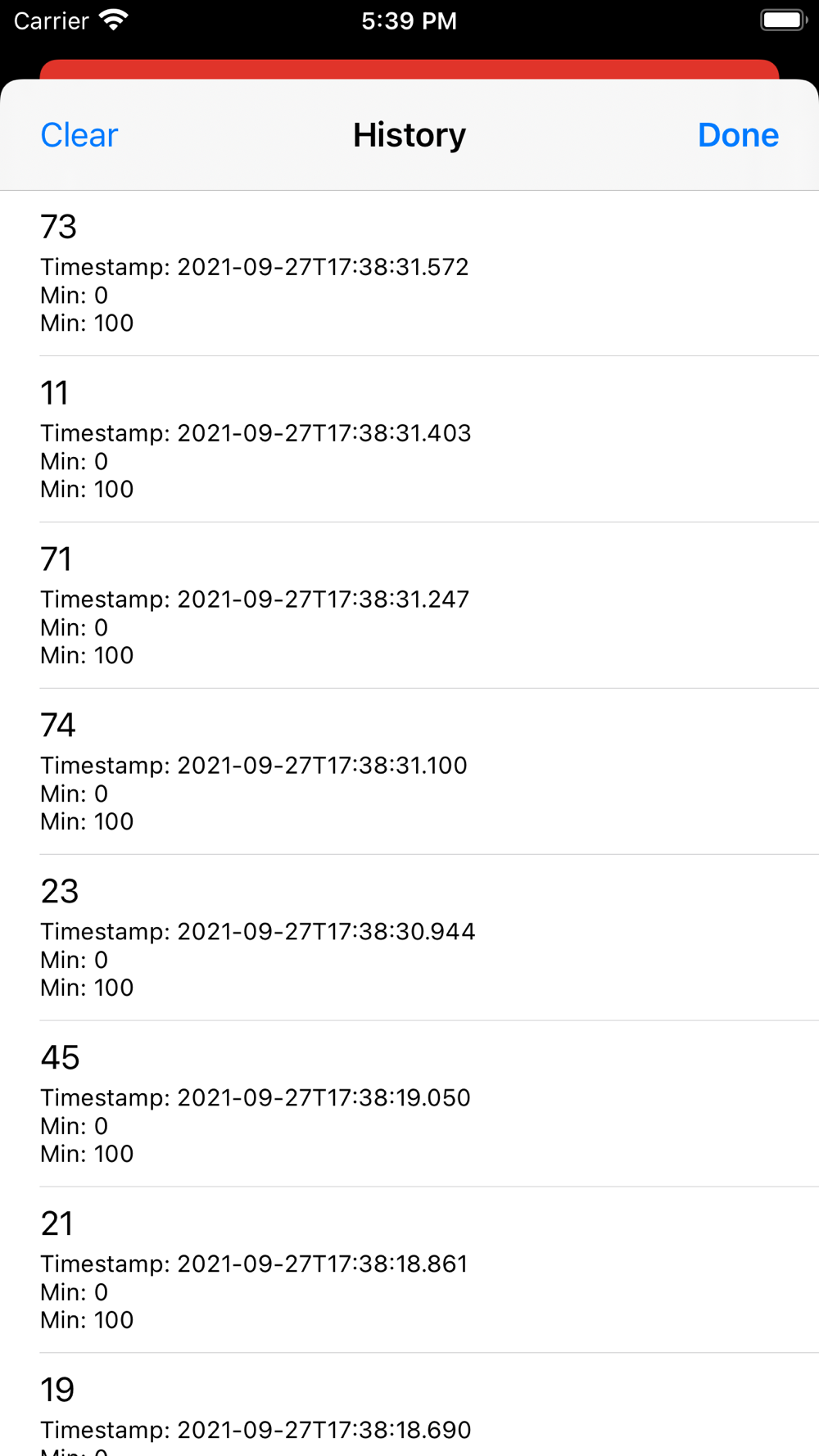 The generated numbers, along with the date and time that the number was generated and the values of what the min and max were, are saved to the history which can be accessed at any time until it is cleared.